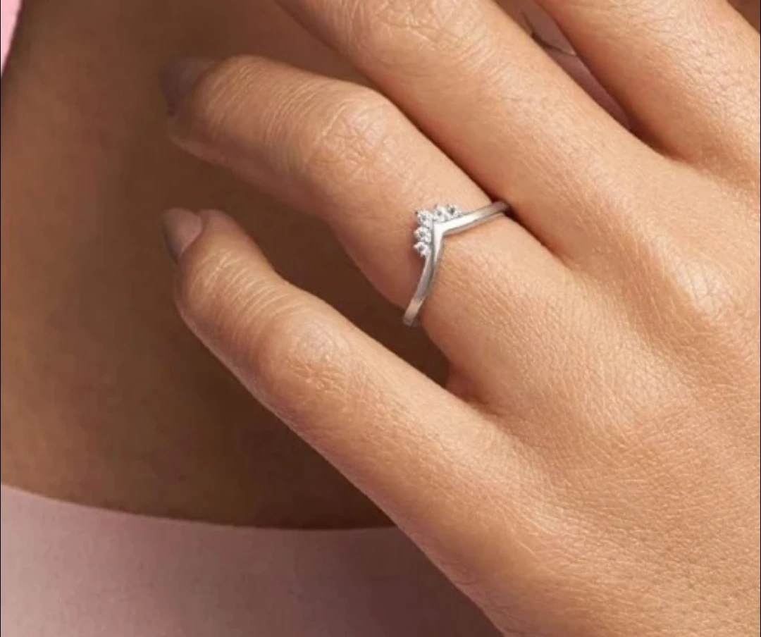 Selling a Pandora Wishbone ring. It's a beautiful piece that adds a touch of elegance to any outfit. The ring features a unique V shape adorned with sparkling stones. Perfect for stacking with other rings or wearing alone for a minimalist look!