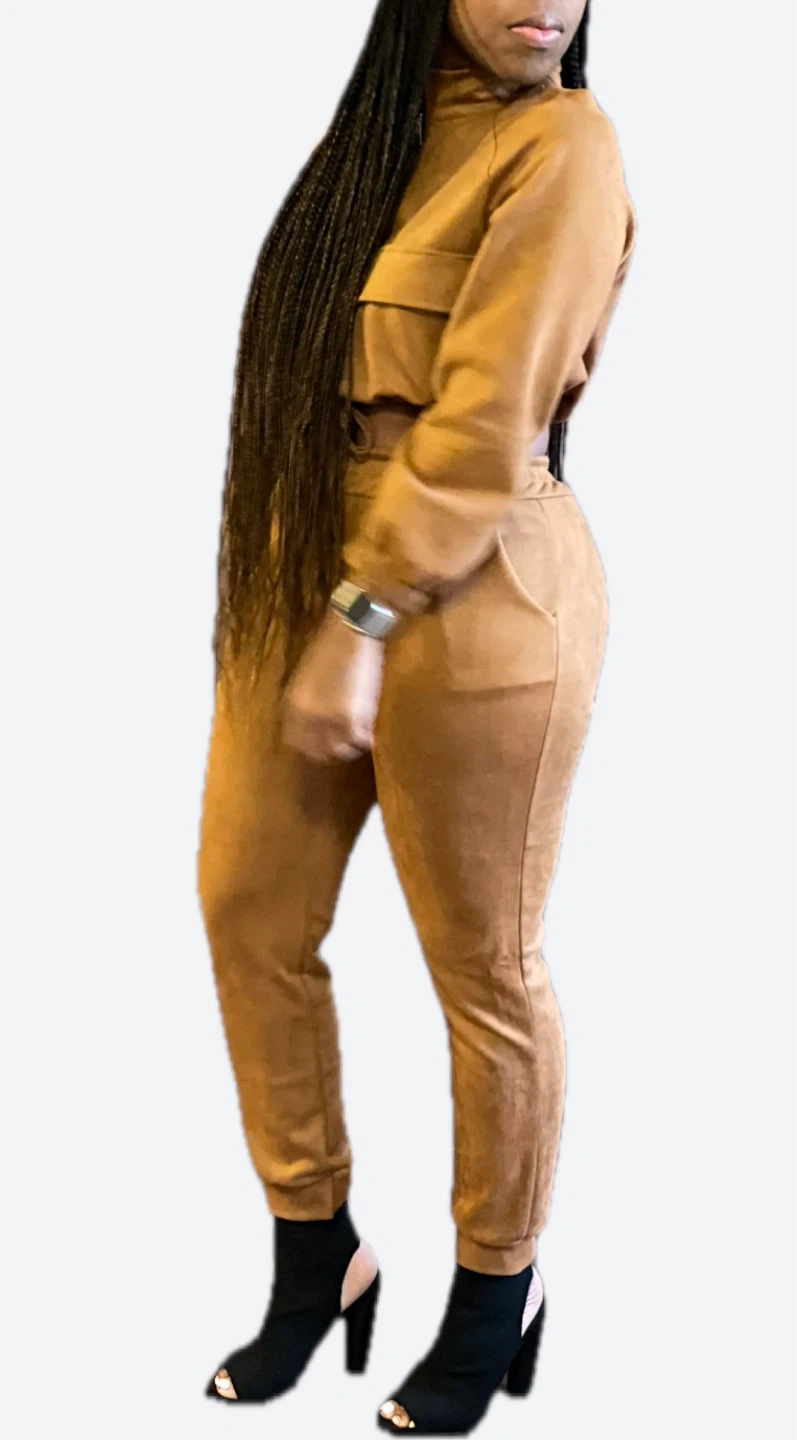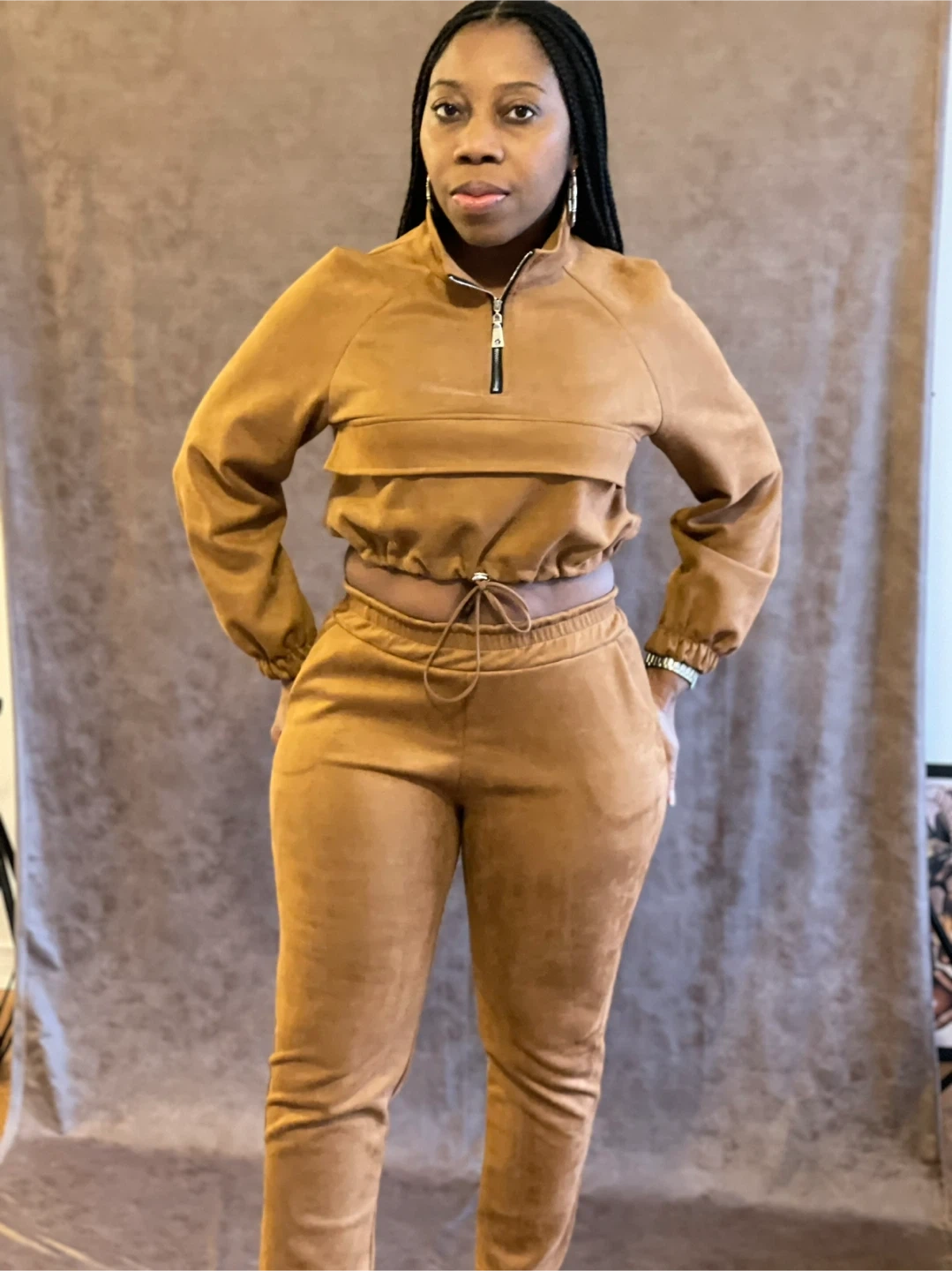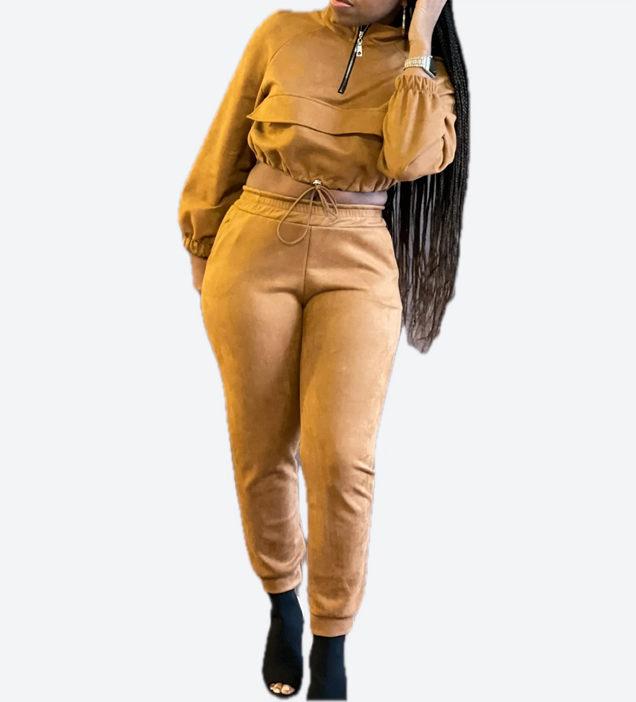 It features a cropped long-sleeve top with a zipper and matching pants with a drawstring. Perfect for a casual and comfy look!