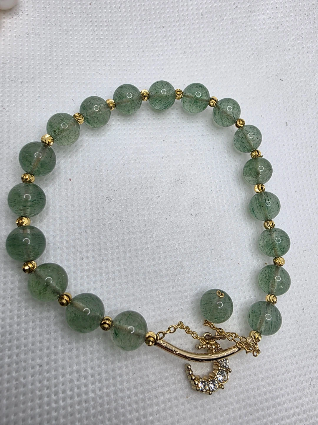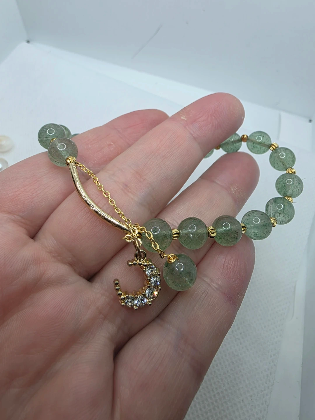 Selling a lovely green strawberry quartz crystal beaded bracelet. It has a small crescent moon charm. It's in great condition!