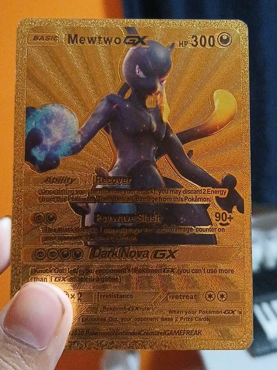 Selling a Mewtwo GX gold plated Pokemon card! It has a unique design and would be a great addition to any collection. The card features the ability 'Recover' and attacks like 'Psywave Slash' and 'Dark Nova GX'.