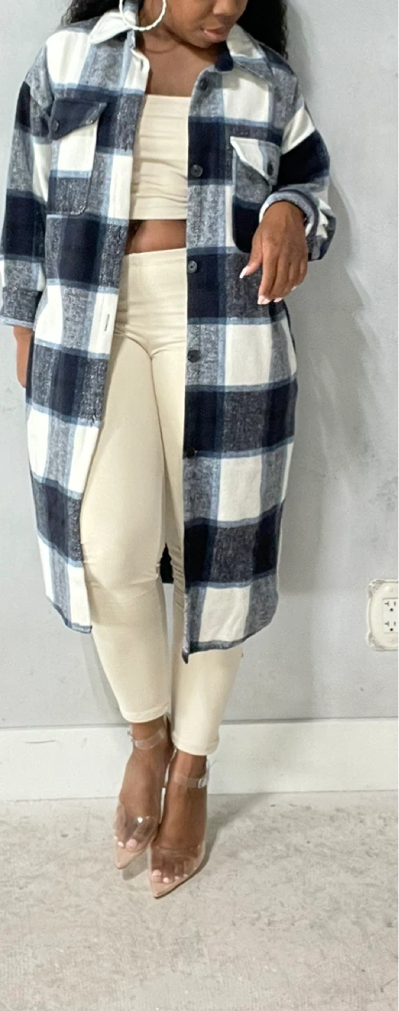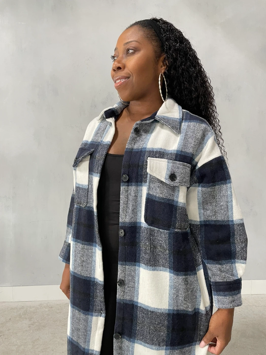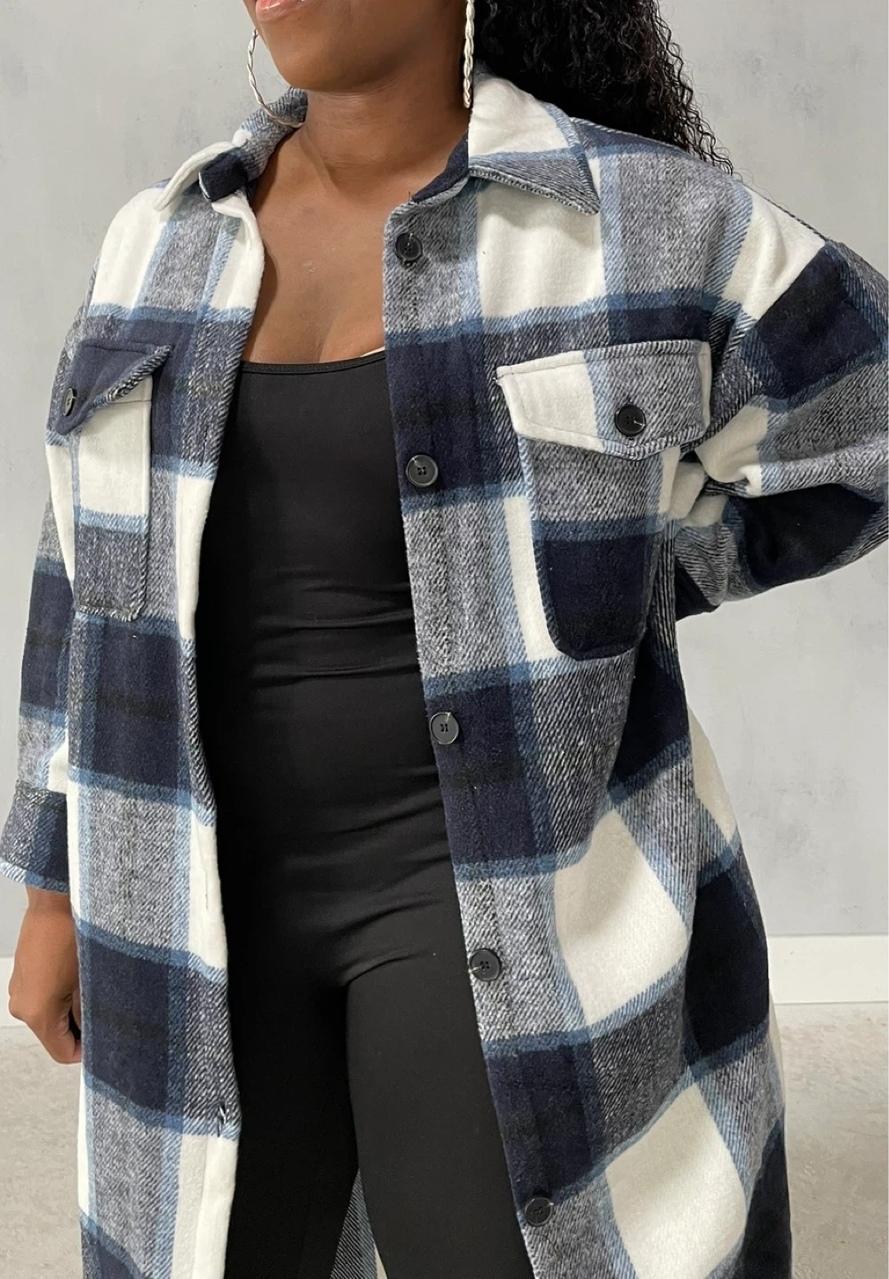 Here's a cozy plaid shacket in blue, white, and black! It's perfect for layering during the cooler months.