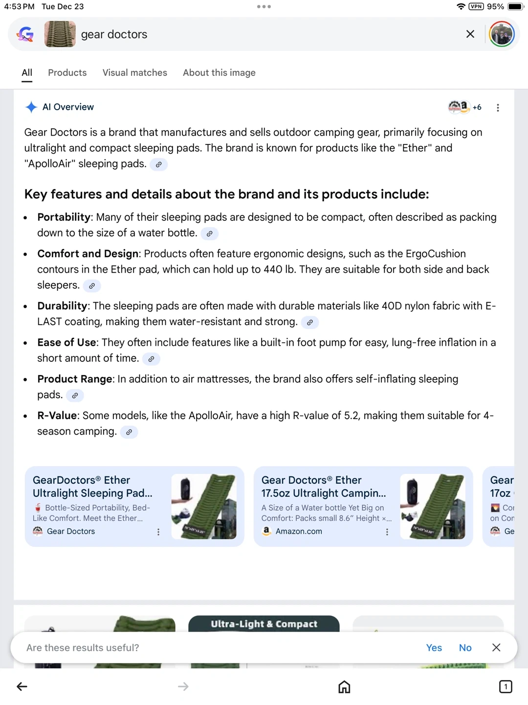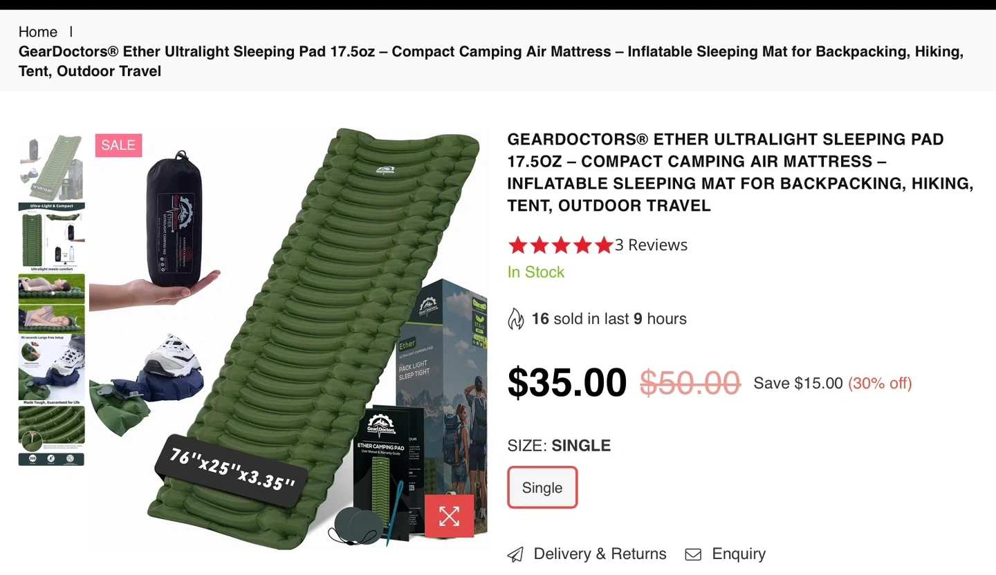 Selling an unused Gear Doctors Ether Ultralight Sleeping Pad. It's designed to be compact, making it easy to pack. It's made with durable materials like 40D nylon fabric with E-LAST coating, so it's water-resistant and strong. Perfect for backpacking, hiking, or camping!