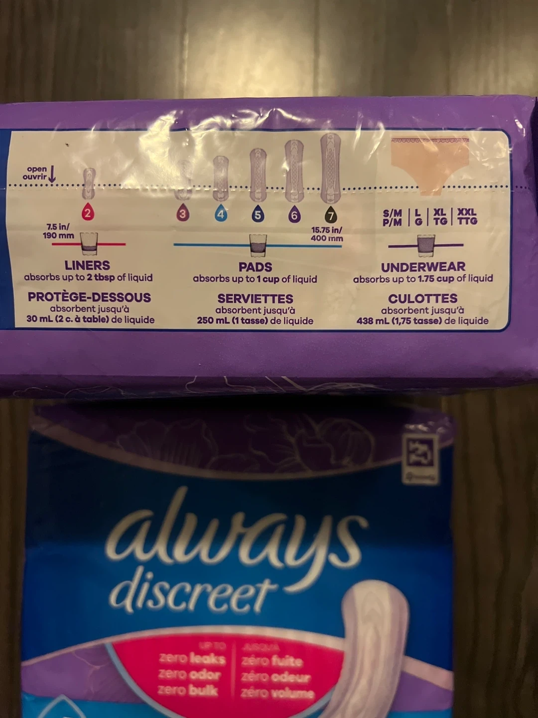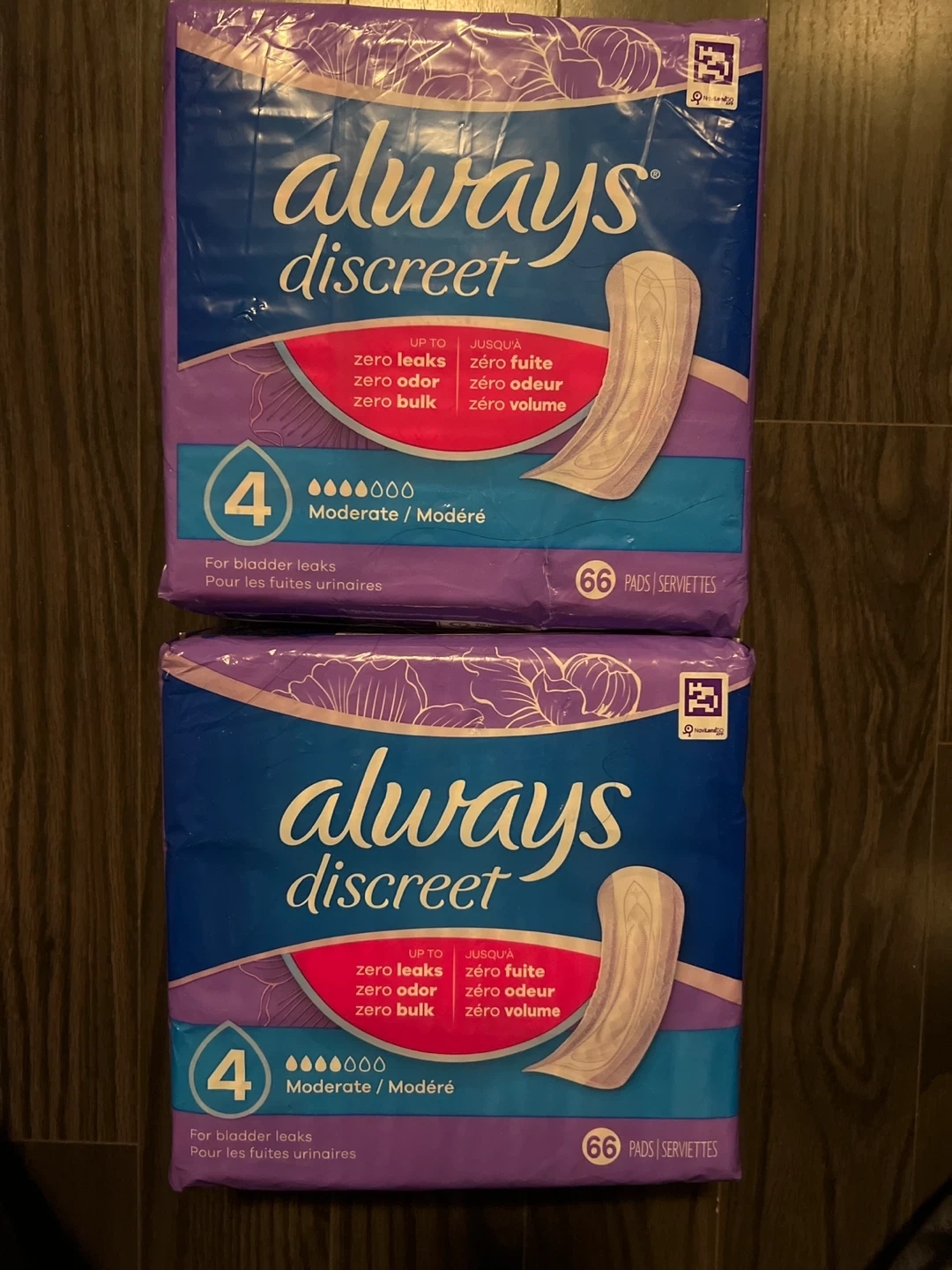 Selling two packs of Always Discreet Moderate Pads, size 4. Each pack contains 66 pads, offering reliable protection and comfort. Perfect for moderate bladder leaks, these pads provide zero leaks, zero odor, and zero bulk. Get the discreet confidence you need!