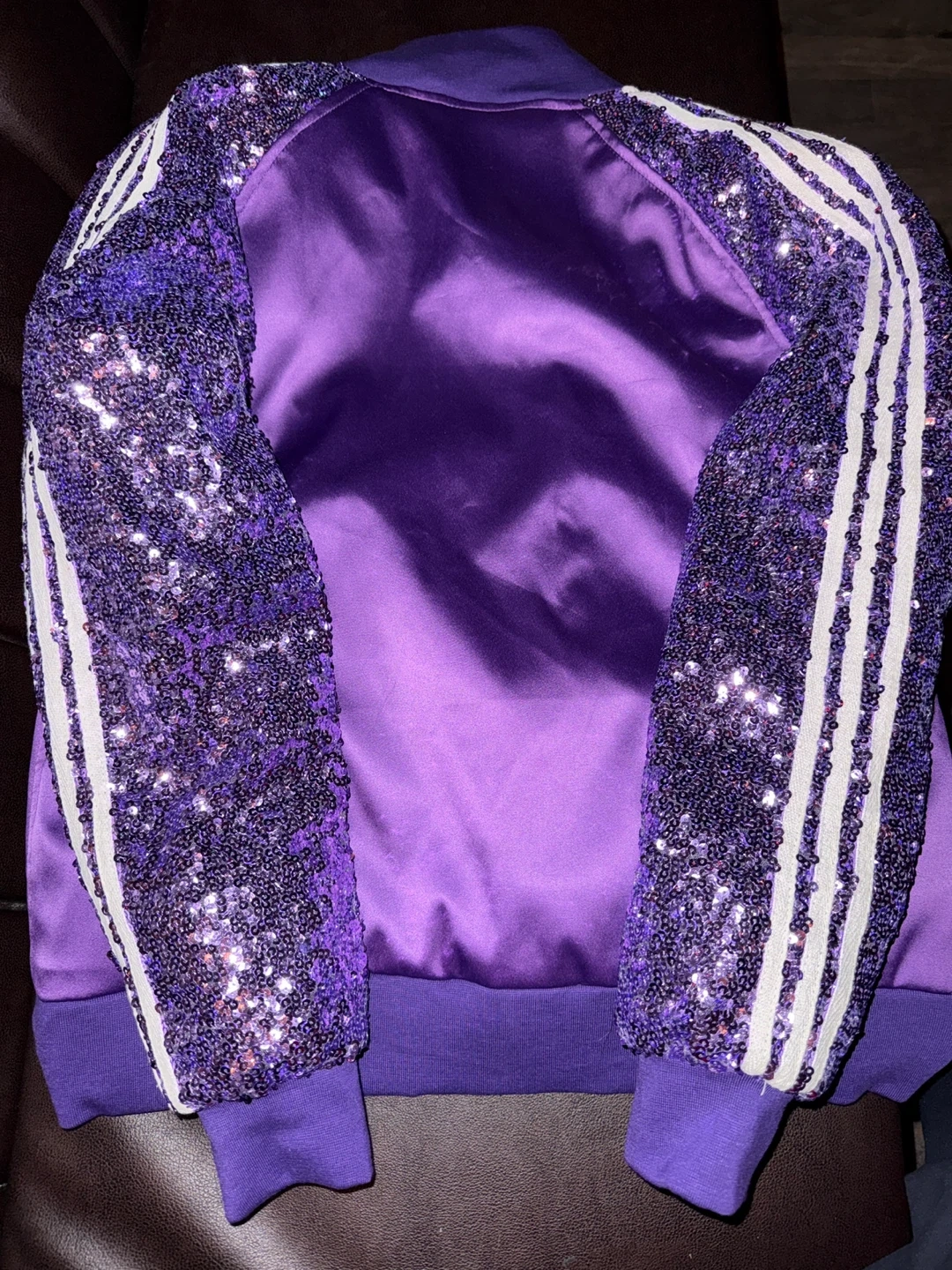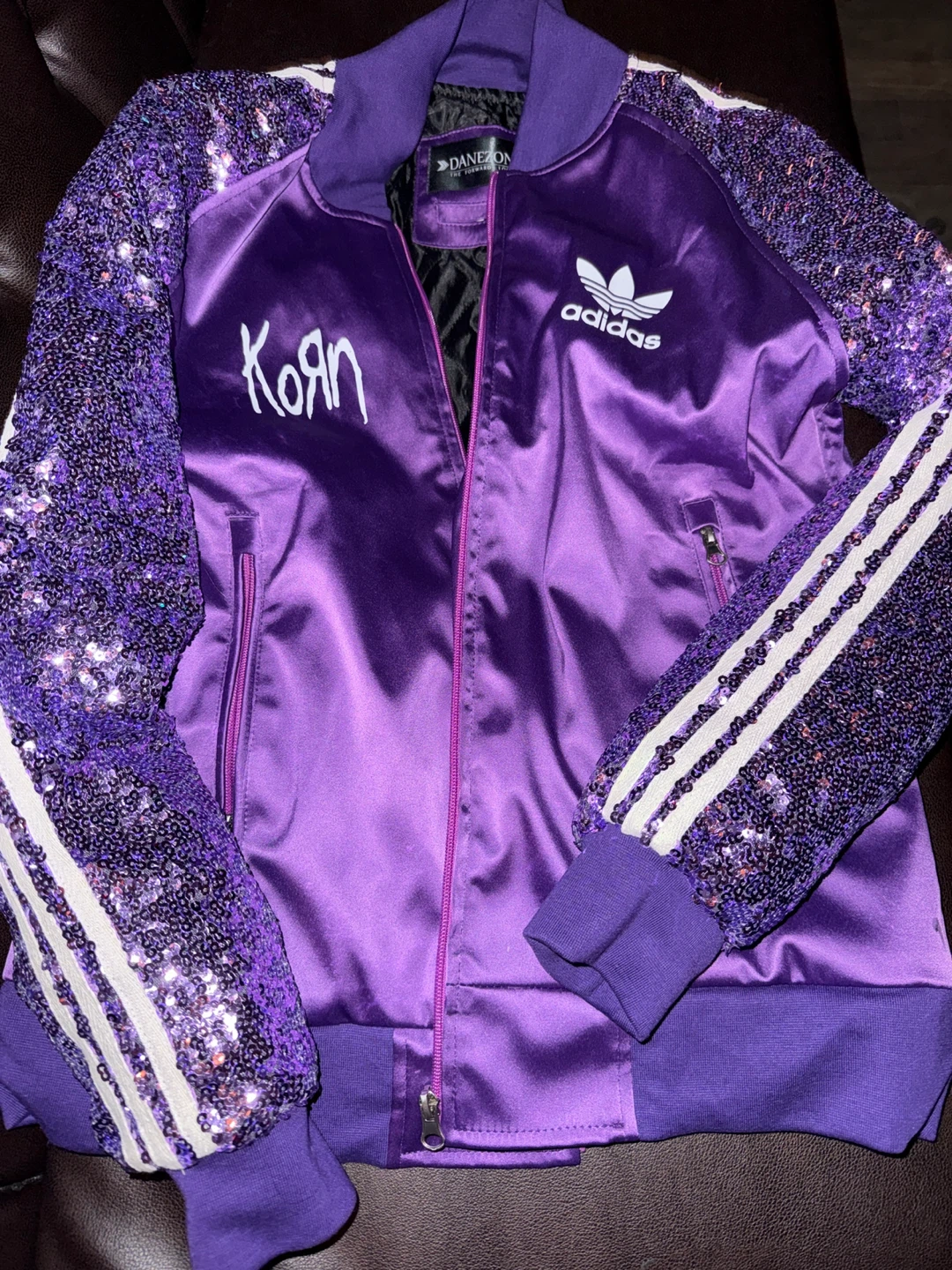 Purple sequence sleeves/purple satin unique Adidas jacket in a vibrant purple colour! It features sequin detailing on the sleeves and the Korn logo on the front. A stylish and eye-catching piece for any wardrobe! This is a similar outfit worn by Korn in concert! Very cozy and stylish!