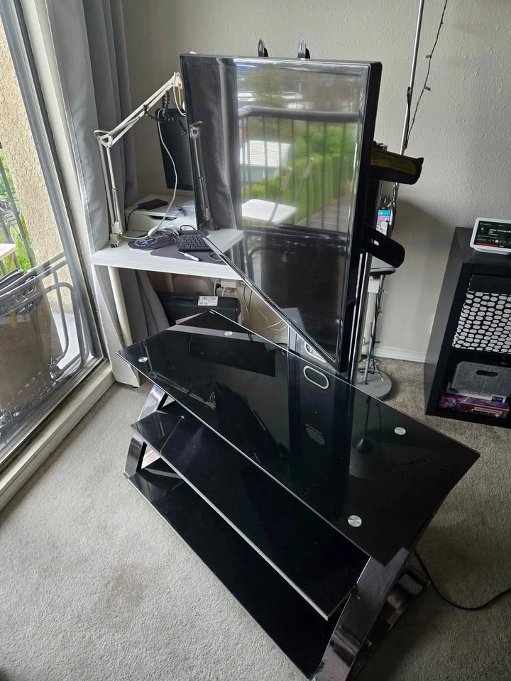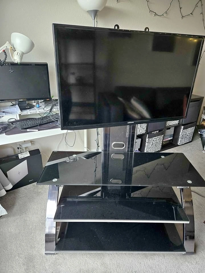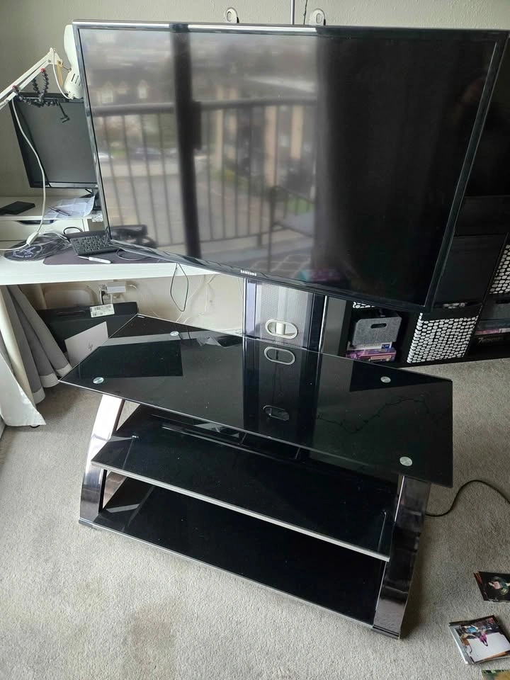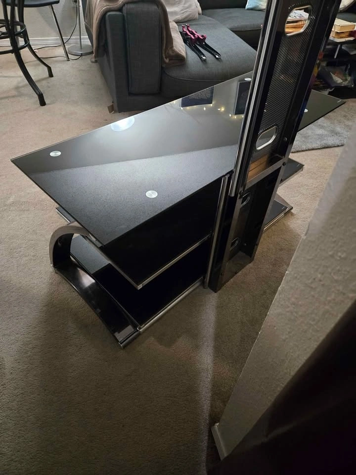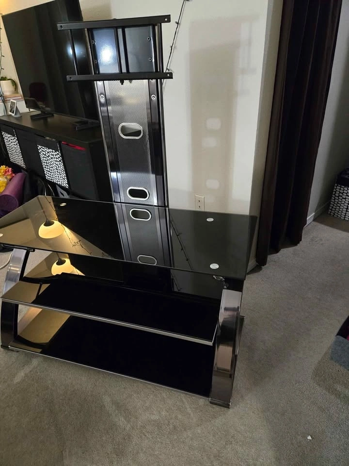 Sleek, modern TV stand with black tempered glass shelves and a built-in swivel TV mount. Solid, heavy, and very stable. Great for a living room, condo, or apartment. The open shelving works well for media devices, consoles, or decor, and the integrated cable management keeps things looking tidy.