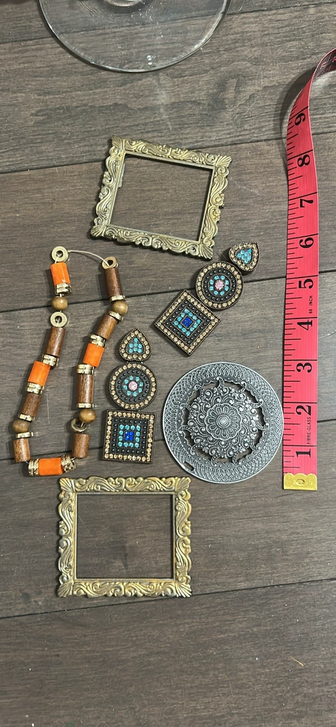 Selling a mixed lot of decorative items! Includes two small gold-coloured picture frames, a wooden and orange beaded necklace, two pairs of earrings, and a decorative silver-coloured disc. The tape measure in the photo shows the approximate size of the items.