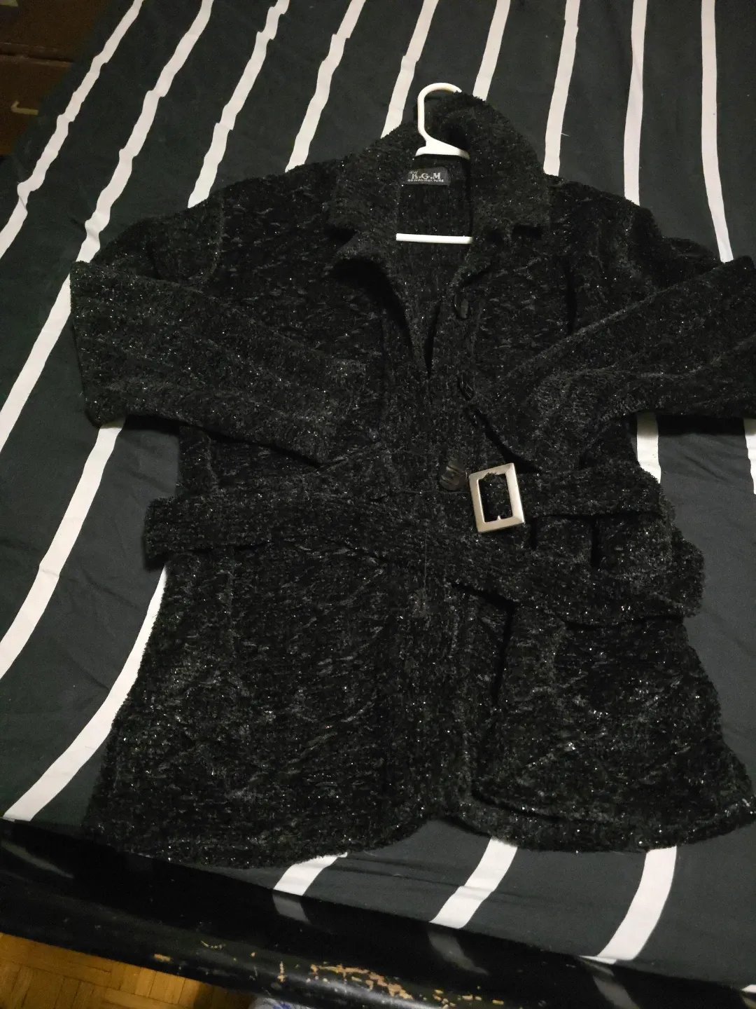 Here's a stylish black coat from B.G.M.! It features a belted design and looks great for layering during cooler weather. It's new excellent and ready for a new wardrobe