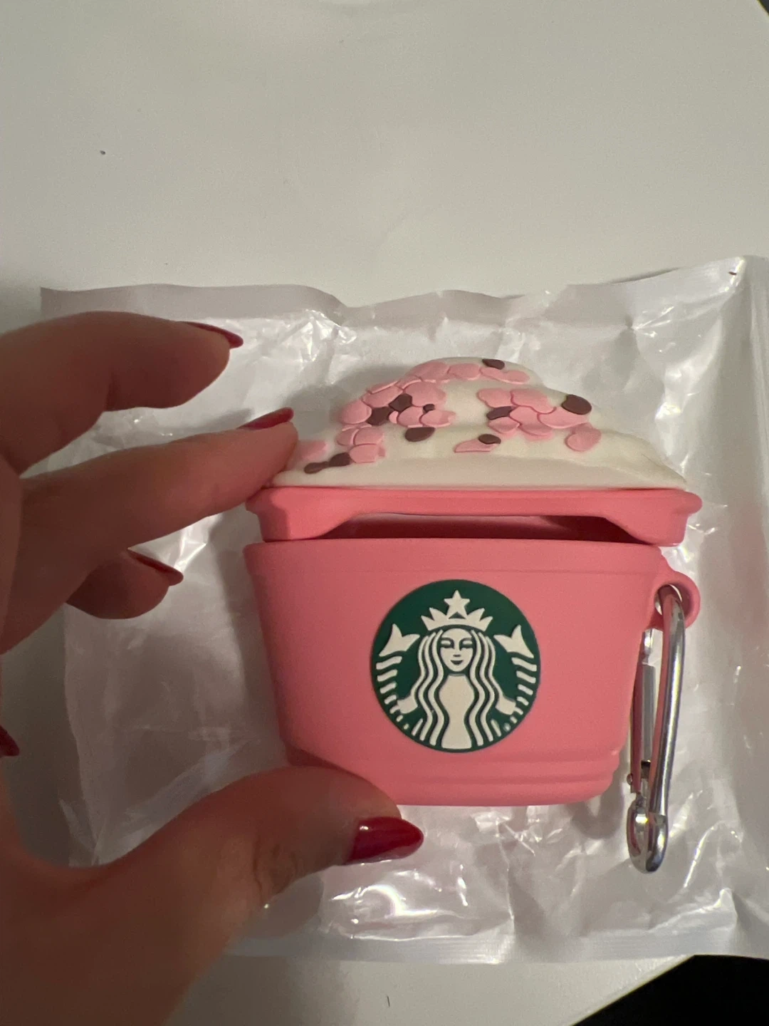 Super cute Starbucks AirPods case in pink! It's designed to look like a sakura frappuccino. Perfect for adding a touch of fun to your AirPods!