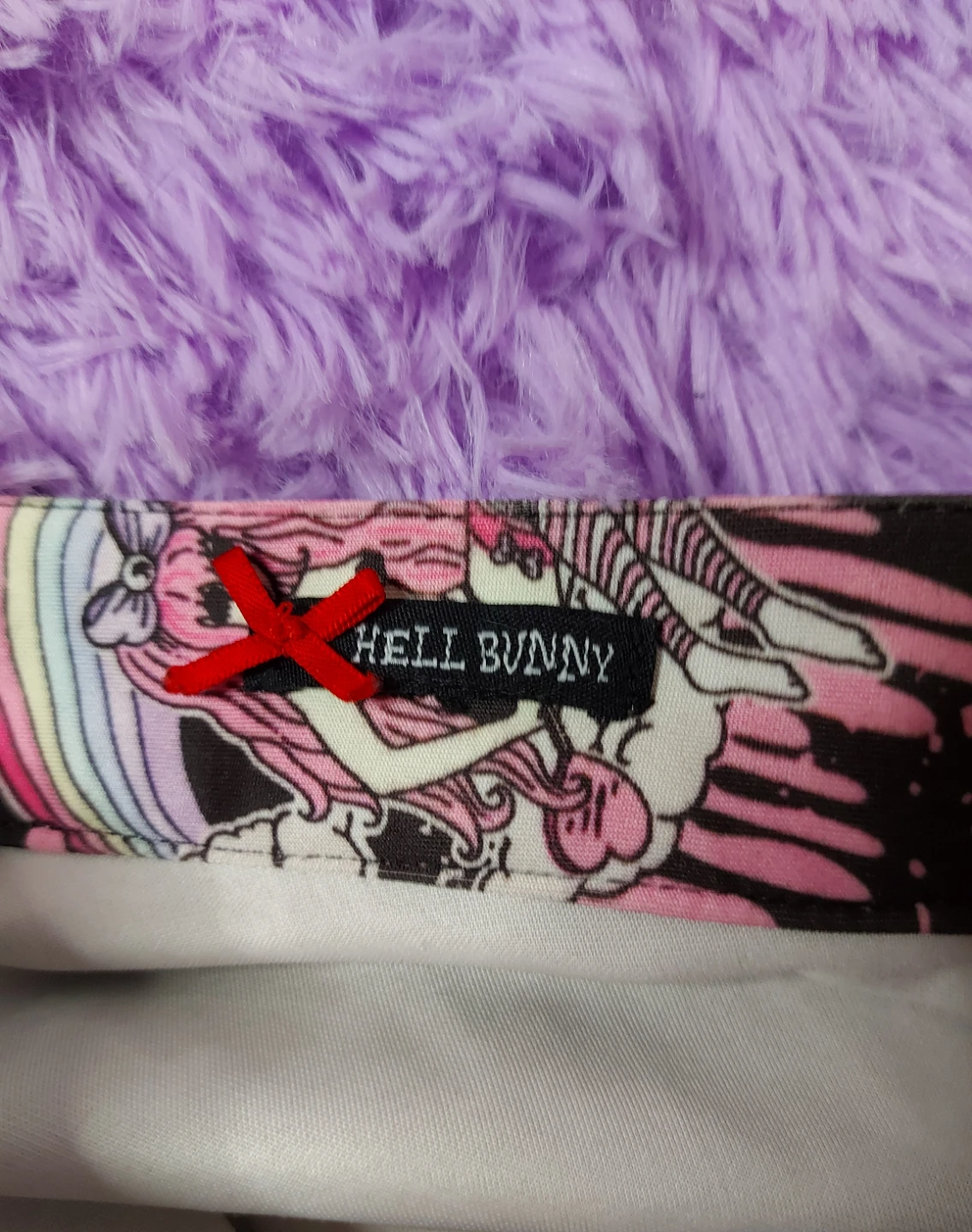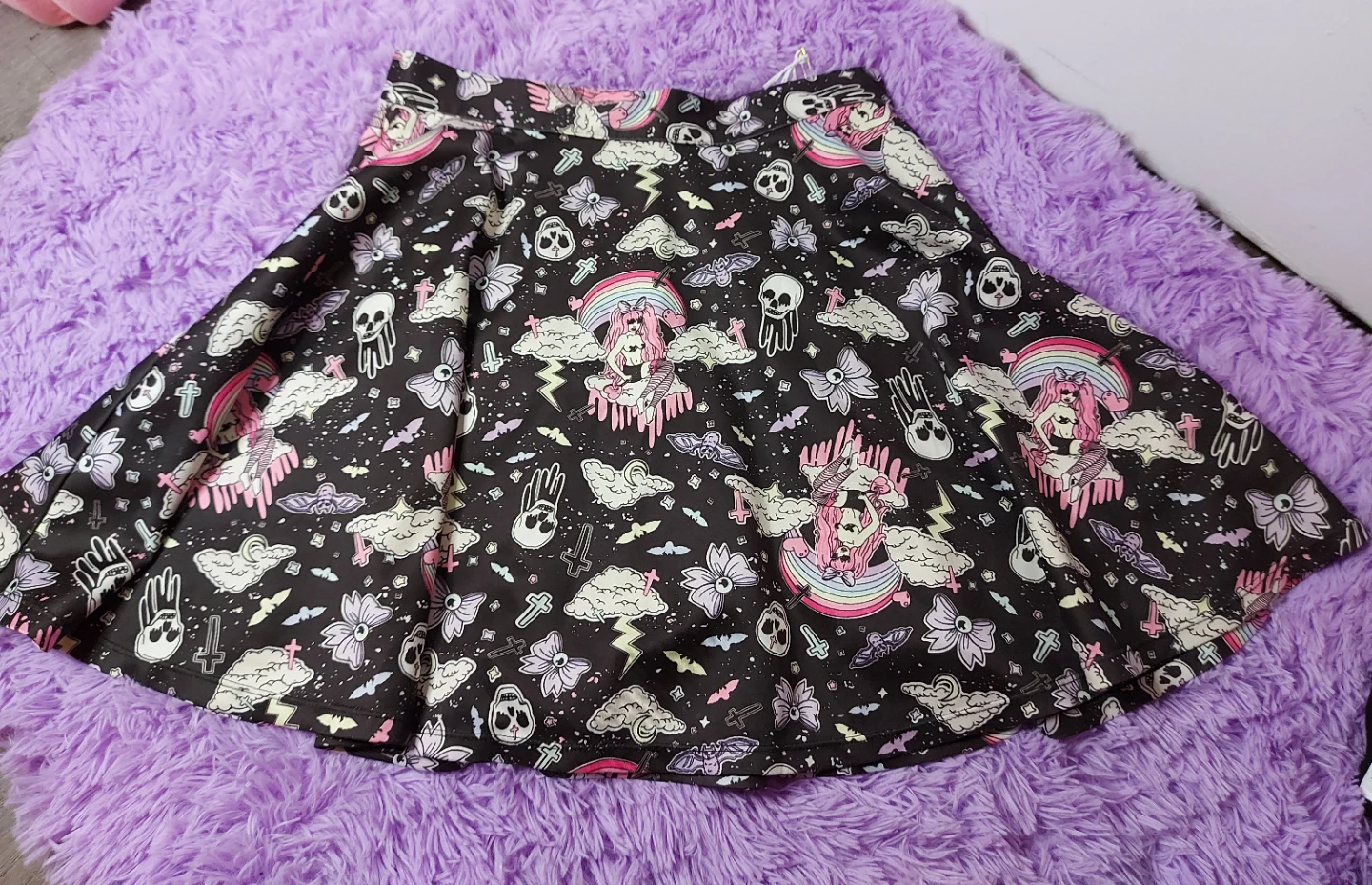 Selling a Hell Bunny skirt with a unique pattern! It features skulls, bats, crosses, and other fun designs on a dark background. It's in great condition and ready for a new home.