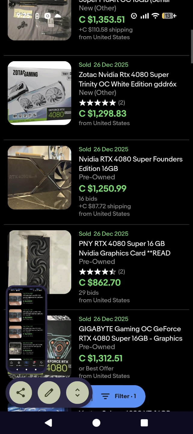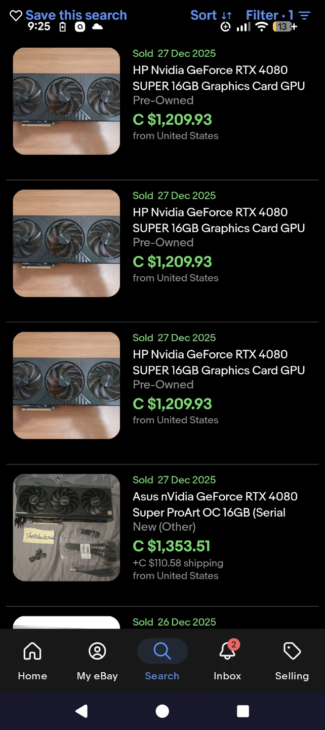 The average eBay sales prices right now for a 4080 super card is around $1300CAD, I am willing to do $1100CAD just to get cash out quickly.