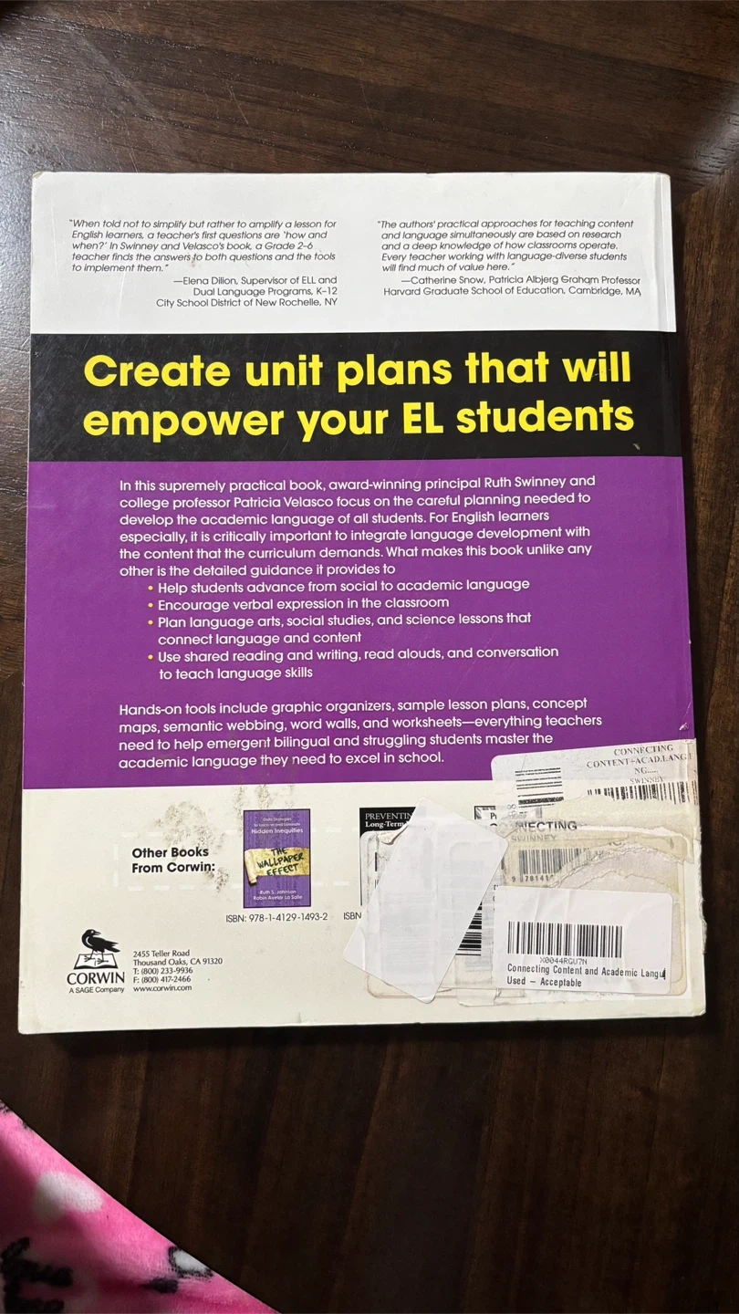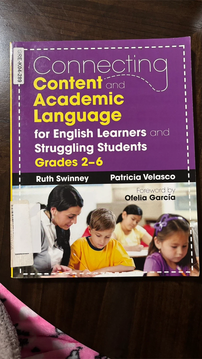 Selling the book 'Connecting Content and Academic Language for English Learners and Struggling Students Grades 2-6' by Ruth Swinney and Patricia Velasco. It's a helpful resource for educators looking to create unit plans that empower their EL students. The book provides hands-on tools including graphic organizers, sample lesson plans, concept maps, semantic webbing, word walls, and worksheets to help emergent bilingual and struggling students master the academic language they need to excel in school.