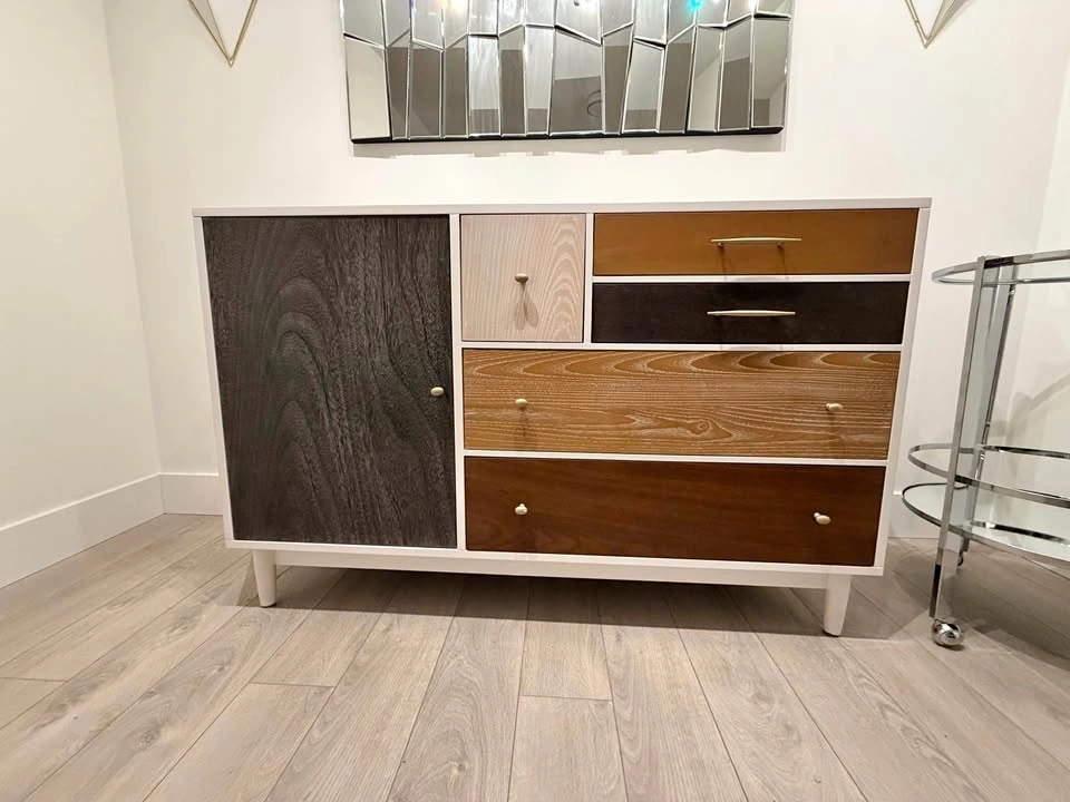 This is a solid, well-built West Elm piece with a high-end look that works beautifully as a dresser, sideboard, media console, credenza, or dining storage. The patchwork design adds warmth and character without overpowering a space, especially well suited for condos or modern interiors.