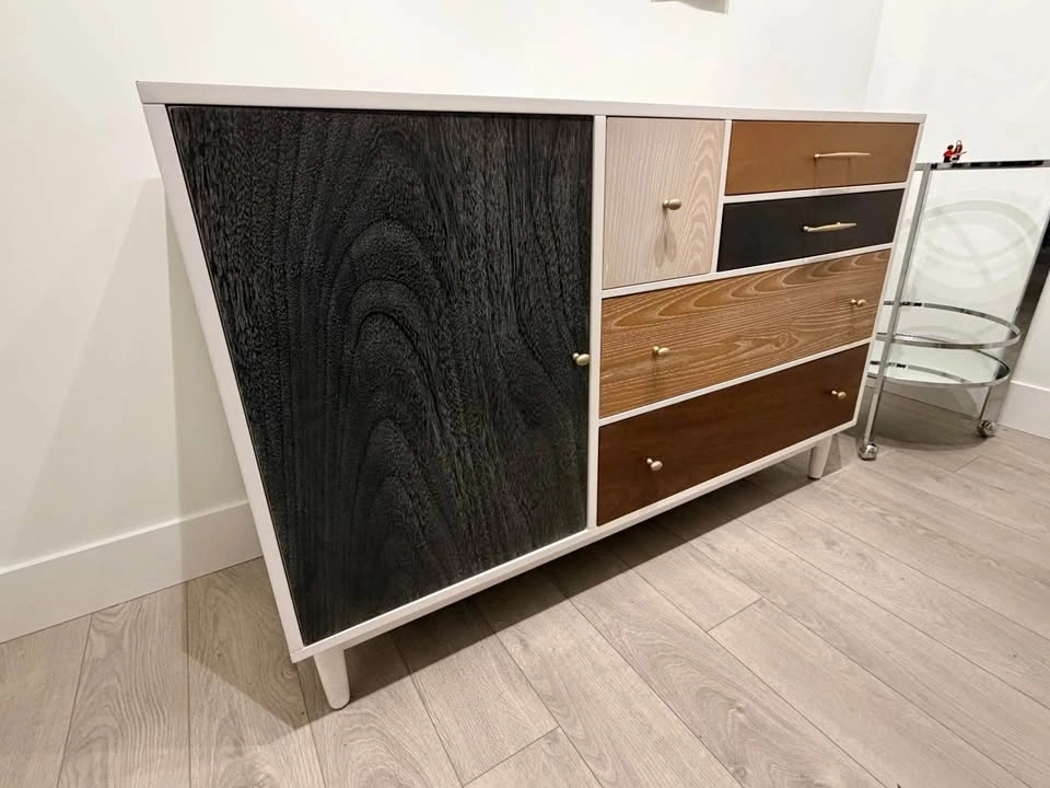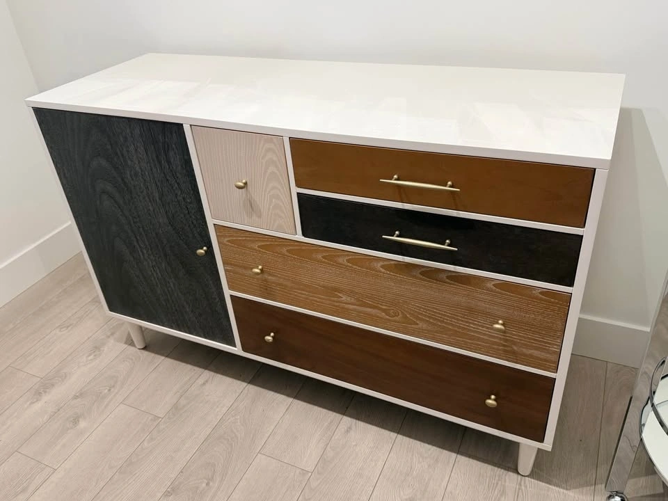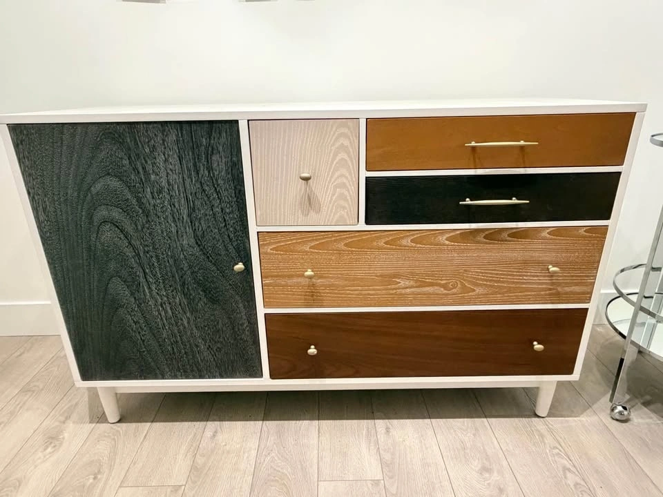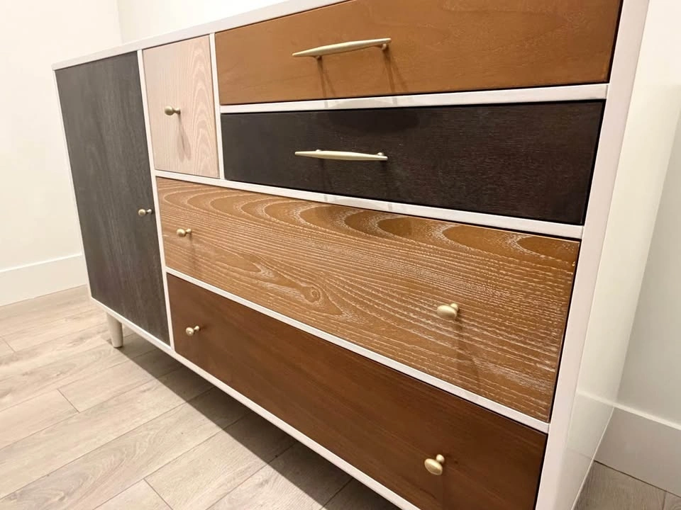A beautiful mid-century modern piece featuring mixed wood drawer fronts, a clean white frame, and brass hardware.