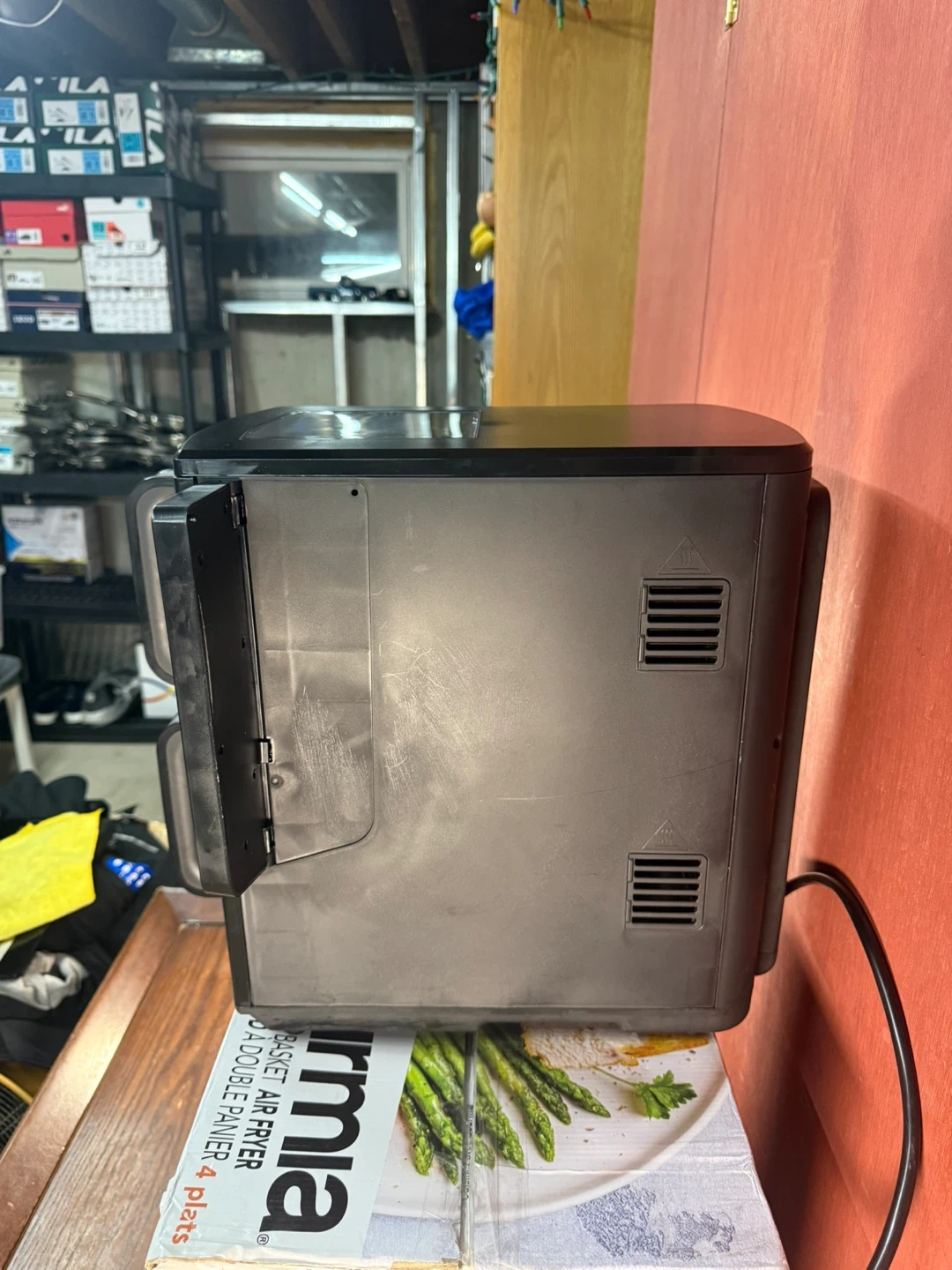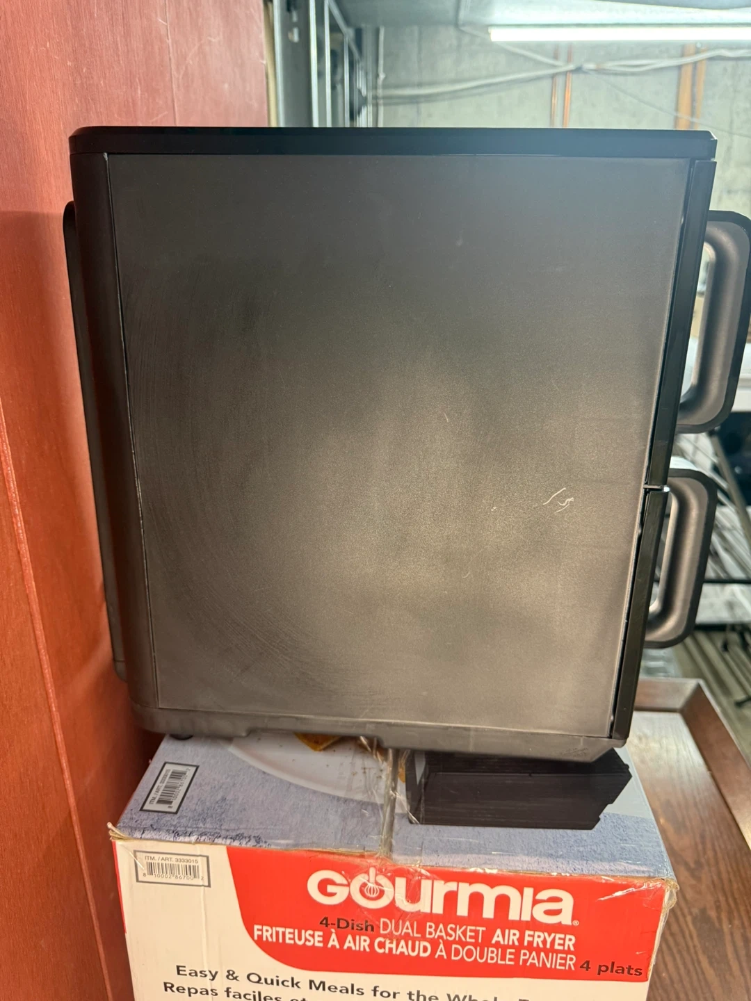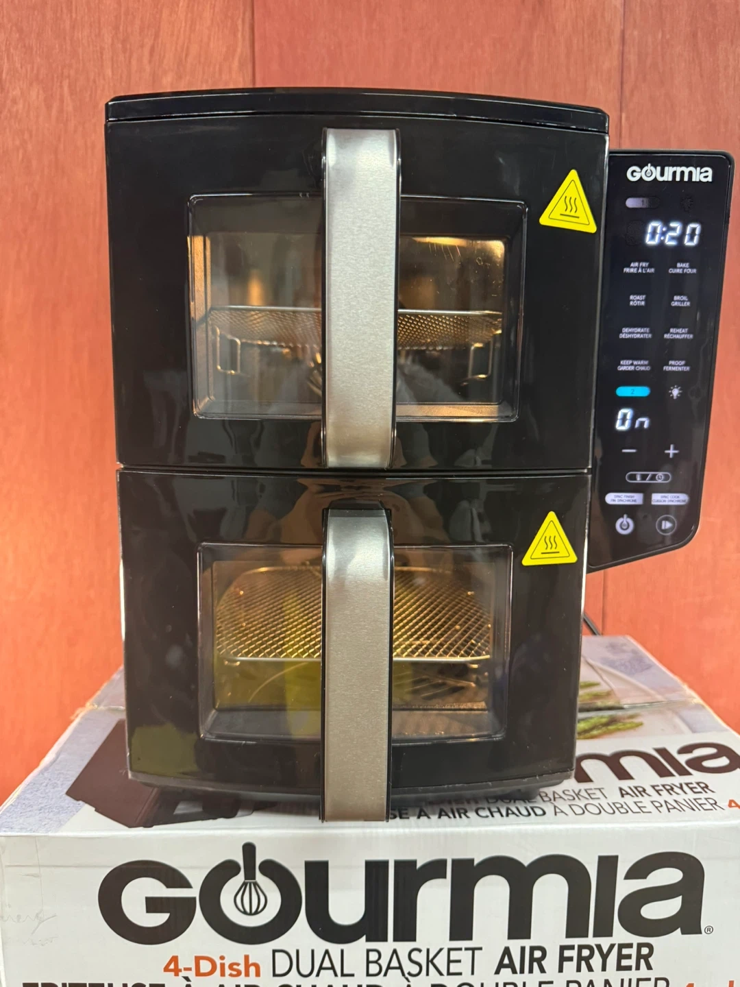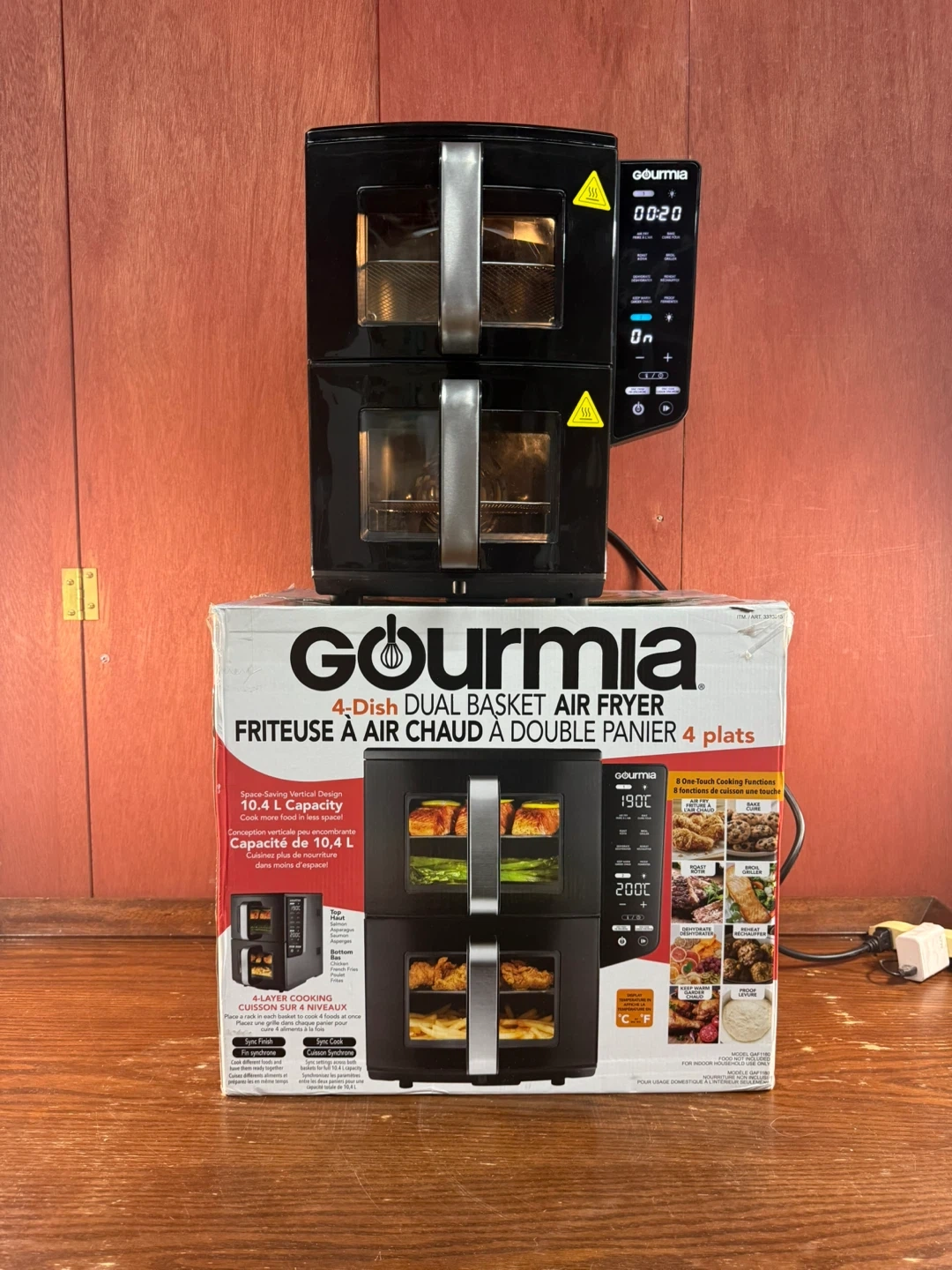 I'm selling a Gourmia 4-Dish Dual Basket Air Fryer with a 10.4 L / 11 qt capacity. This used air fryer is in good condition and perfect for cooking multiple dishes at once with its sync finish feature, allowing you to cook different foods simultaneously and have them finish at the same time. It’s a fantastic way to simplify meal prep! The digital interface offers pre-set programs.