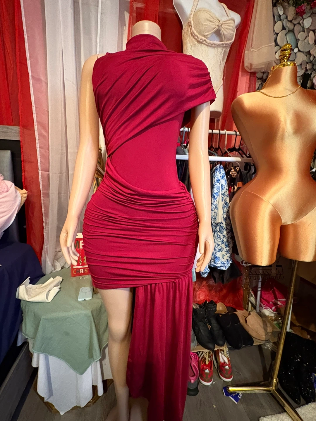 Selling a red ruched asymmetrical dress! It's in great condition and features a unique draped design. Perfect for a night out or special occasion!
