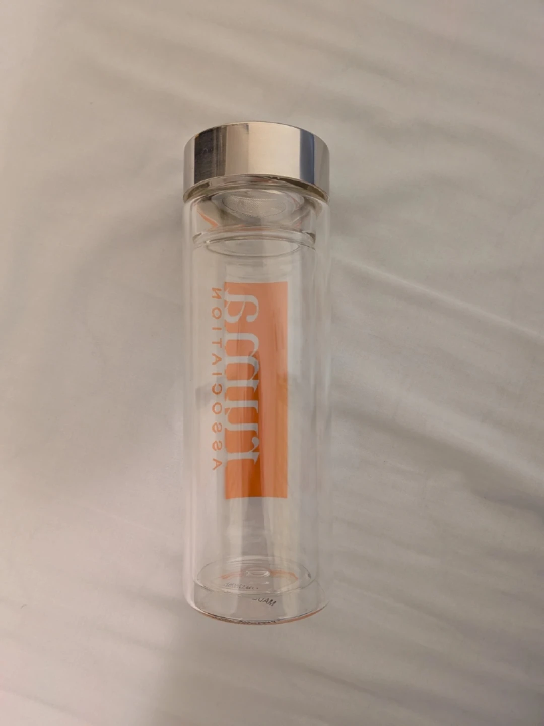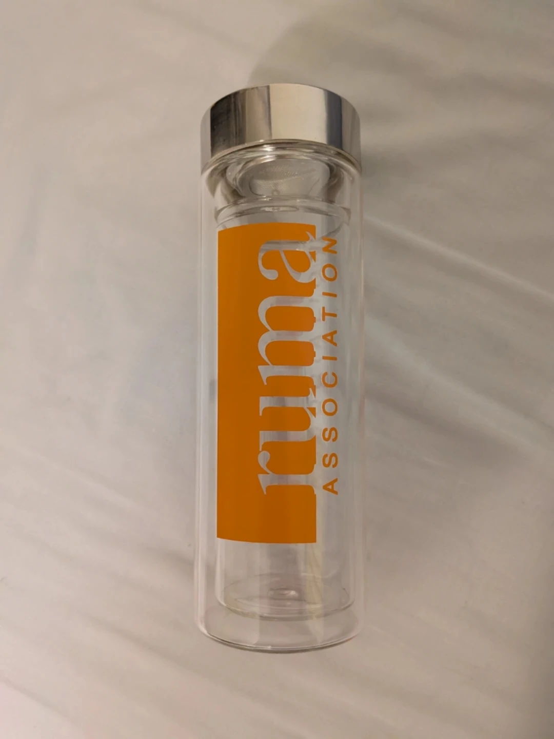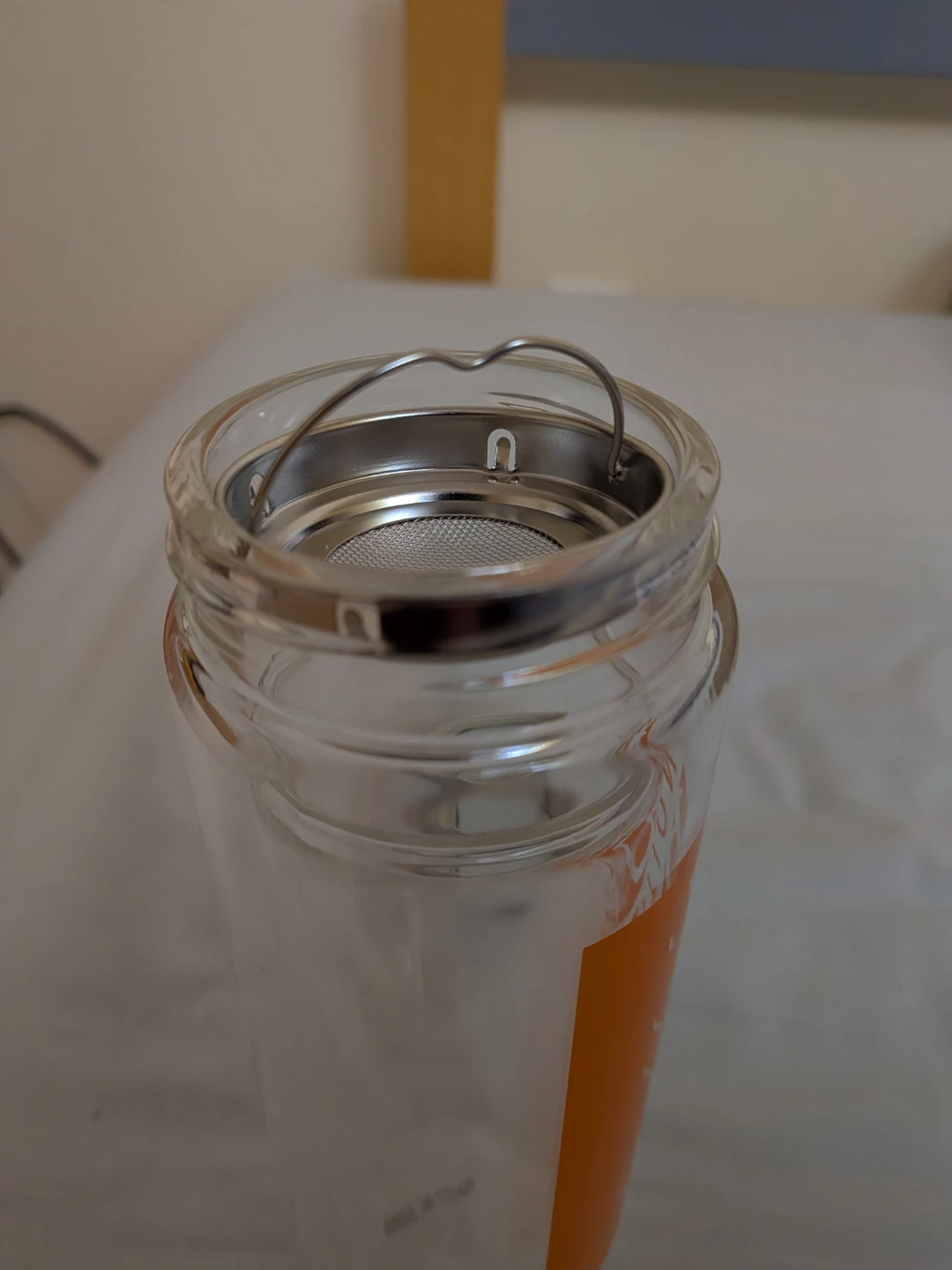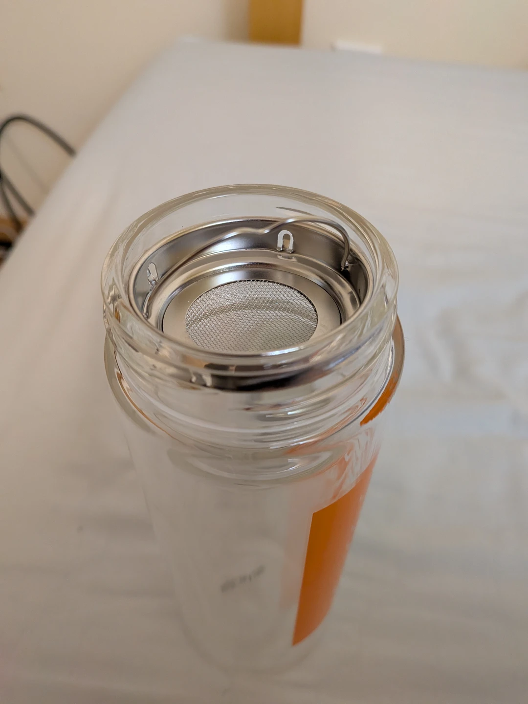 Selling a tea infuser bottle! It's in great shape and ready for a new owner who enjoys loose leaf tea. The bottle is clear with an orange logo and includes the infuser basket.