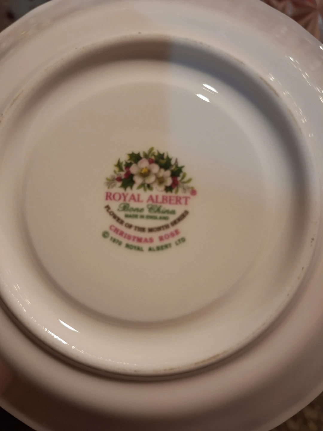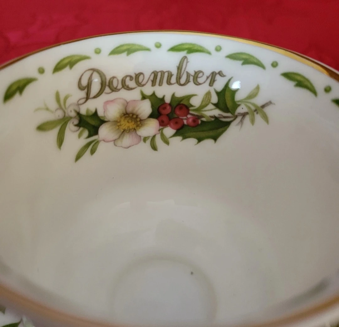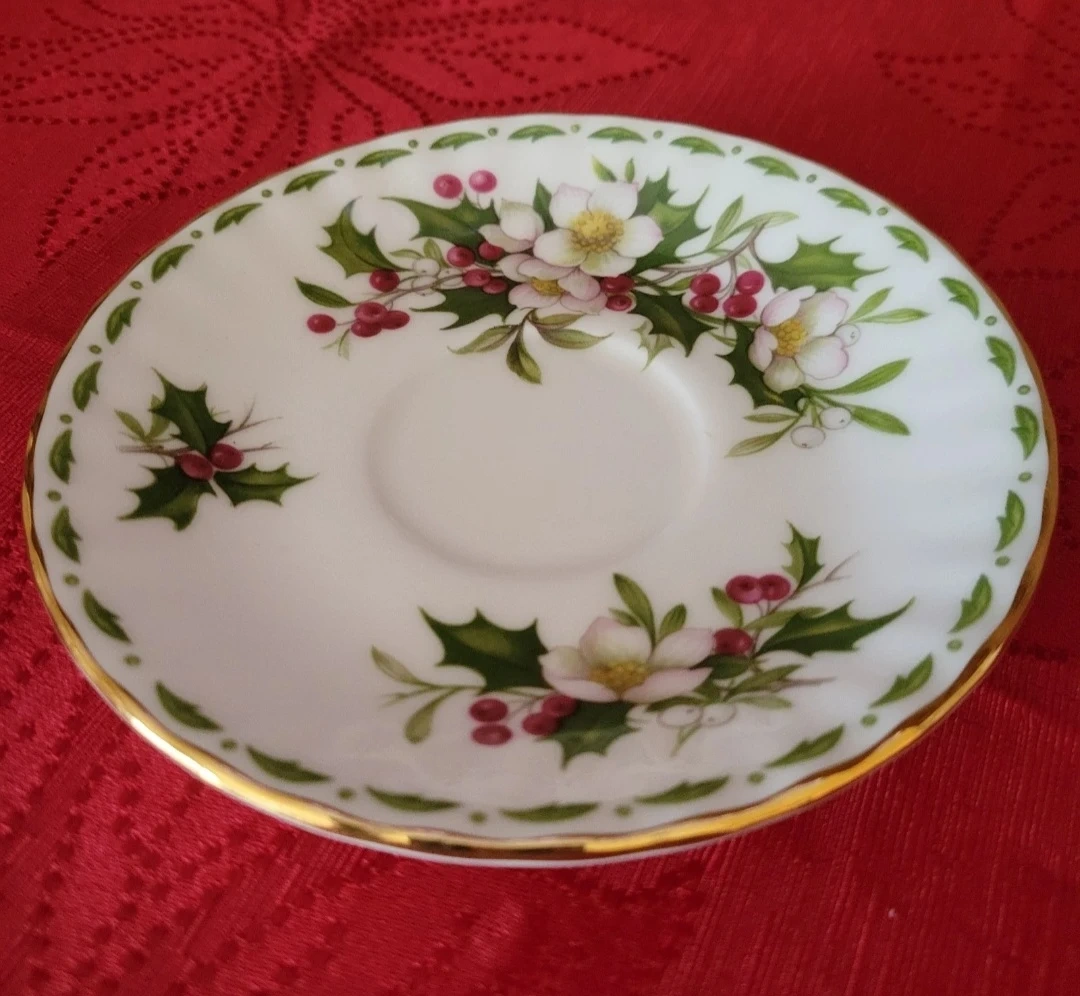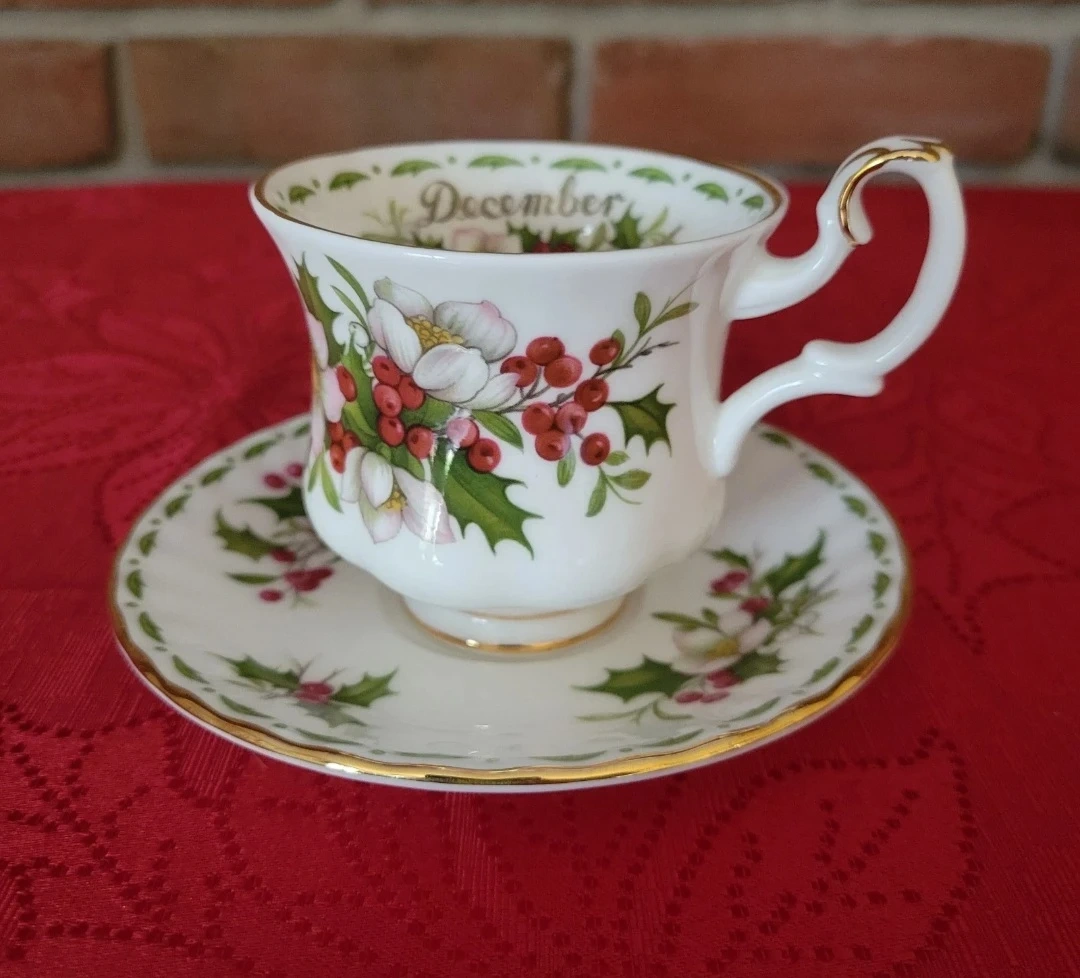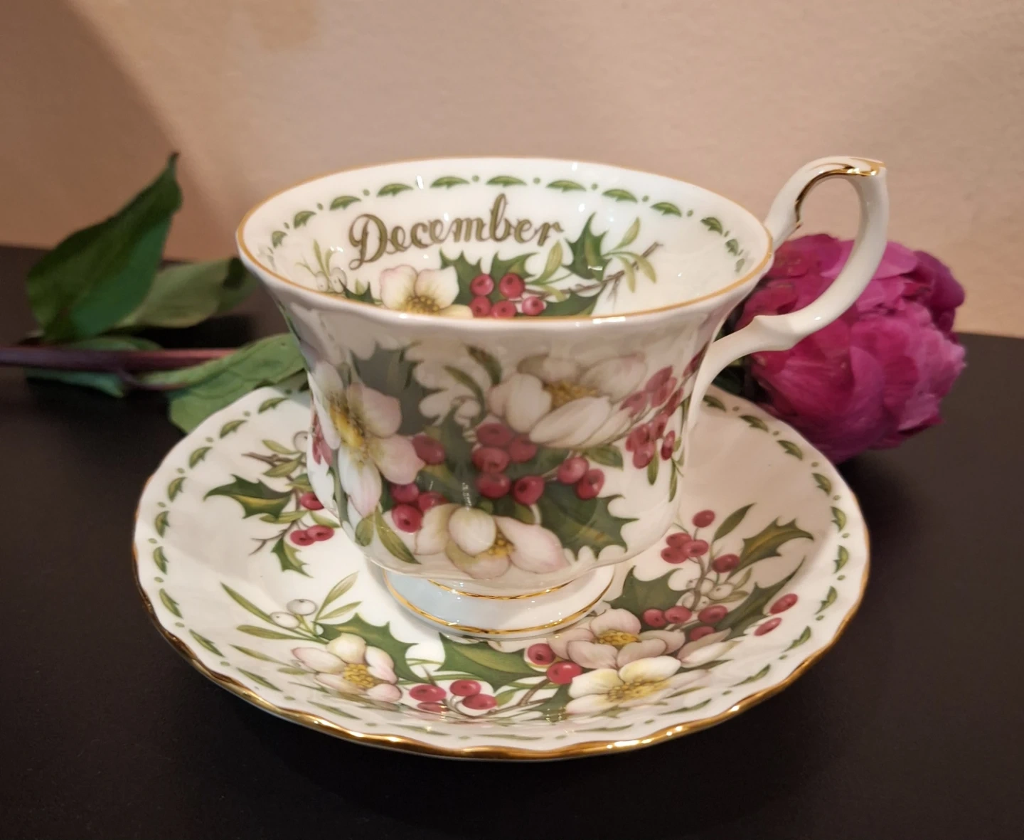 Selling a Royal Albert teacup and saucer set, featuring the December Flower of the Month design. The set is in excellent condition and showcases a beautiful holly and berry pattern with gold trim. Perfect for collectors or anyone who loves fine china!