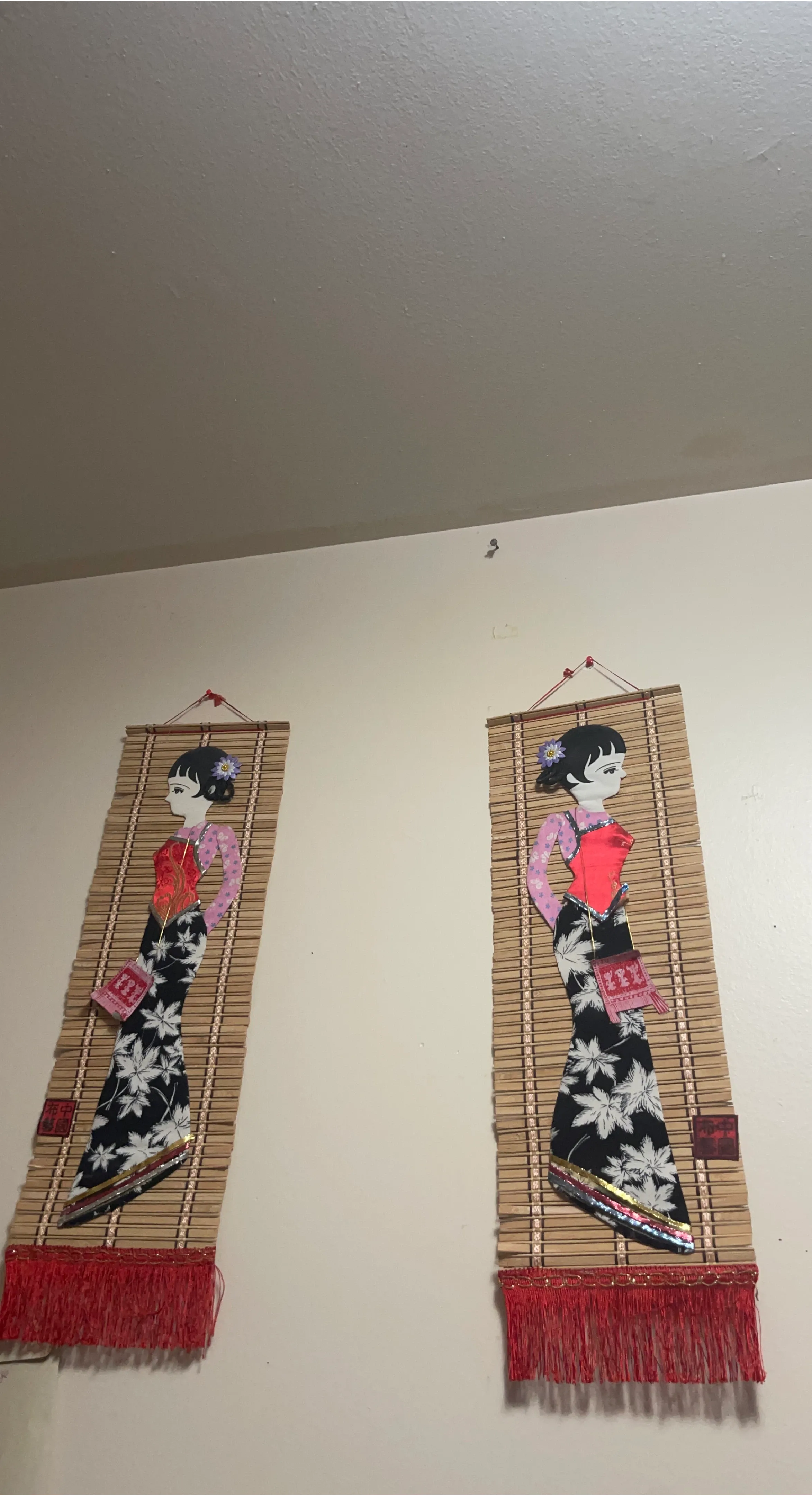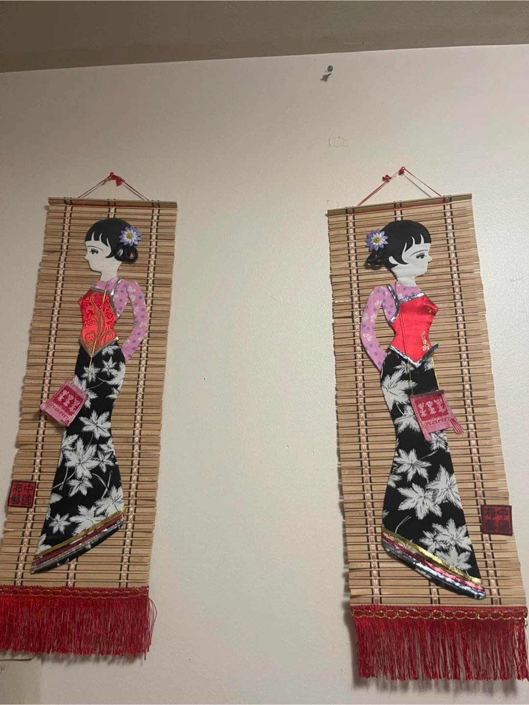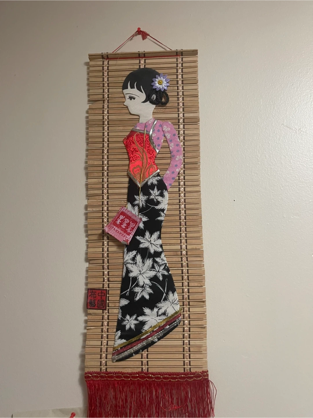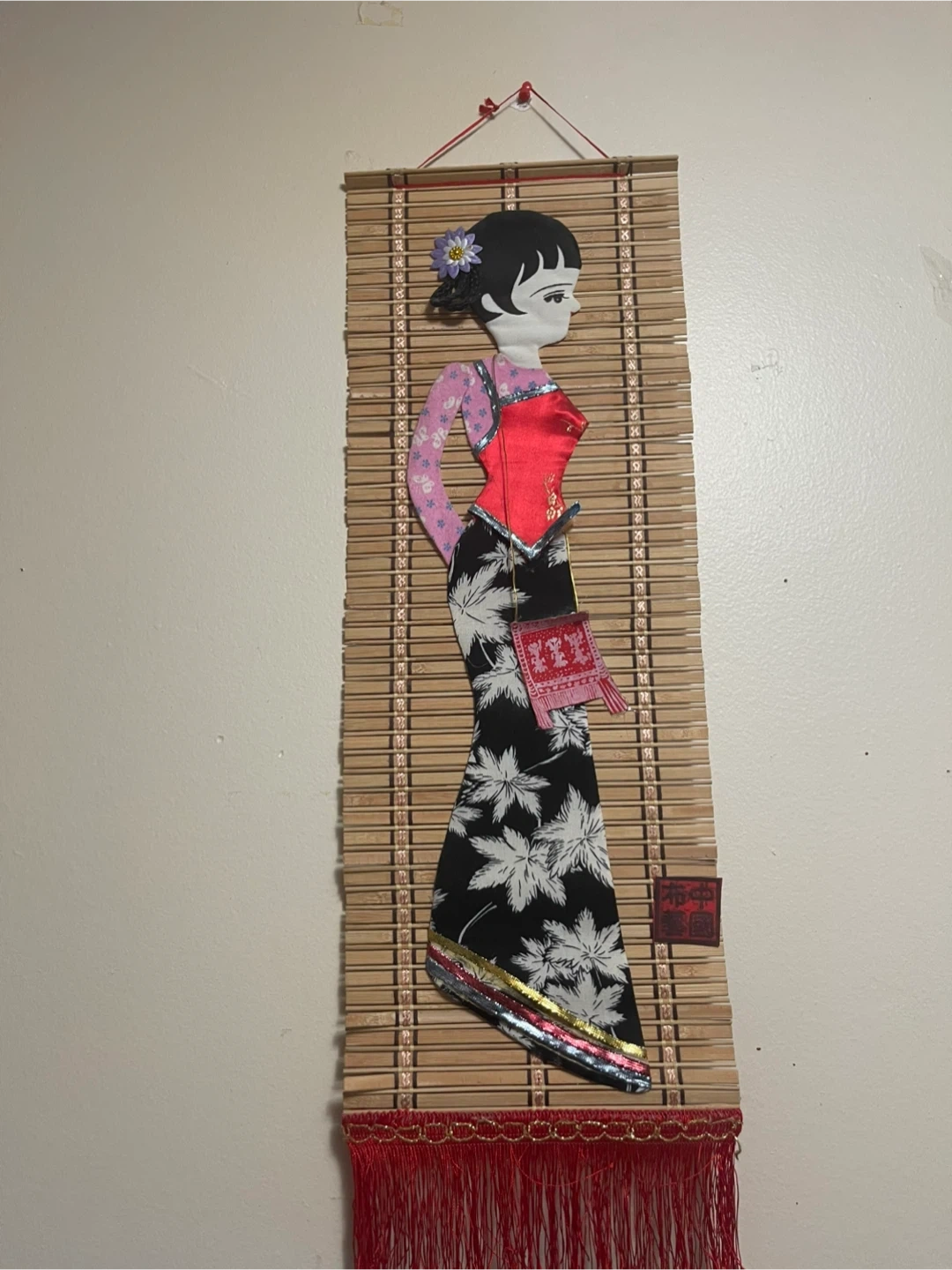 I'm selling this unique Asian-style wall hanging. It features a woman in traditional clothing on a bamboo-like background with red fringe. It's in great condition and would add a touch of cultural flair to any room!