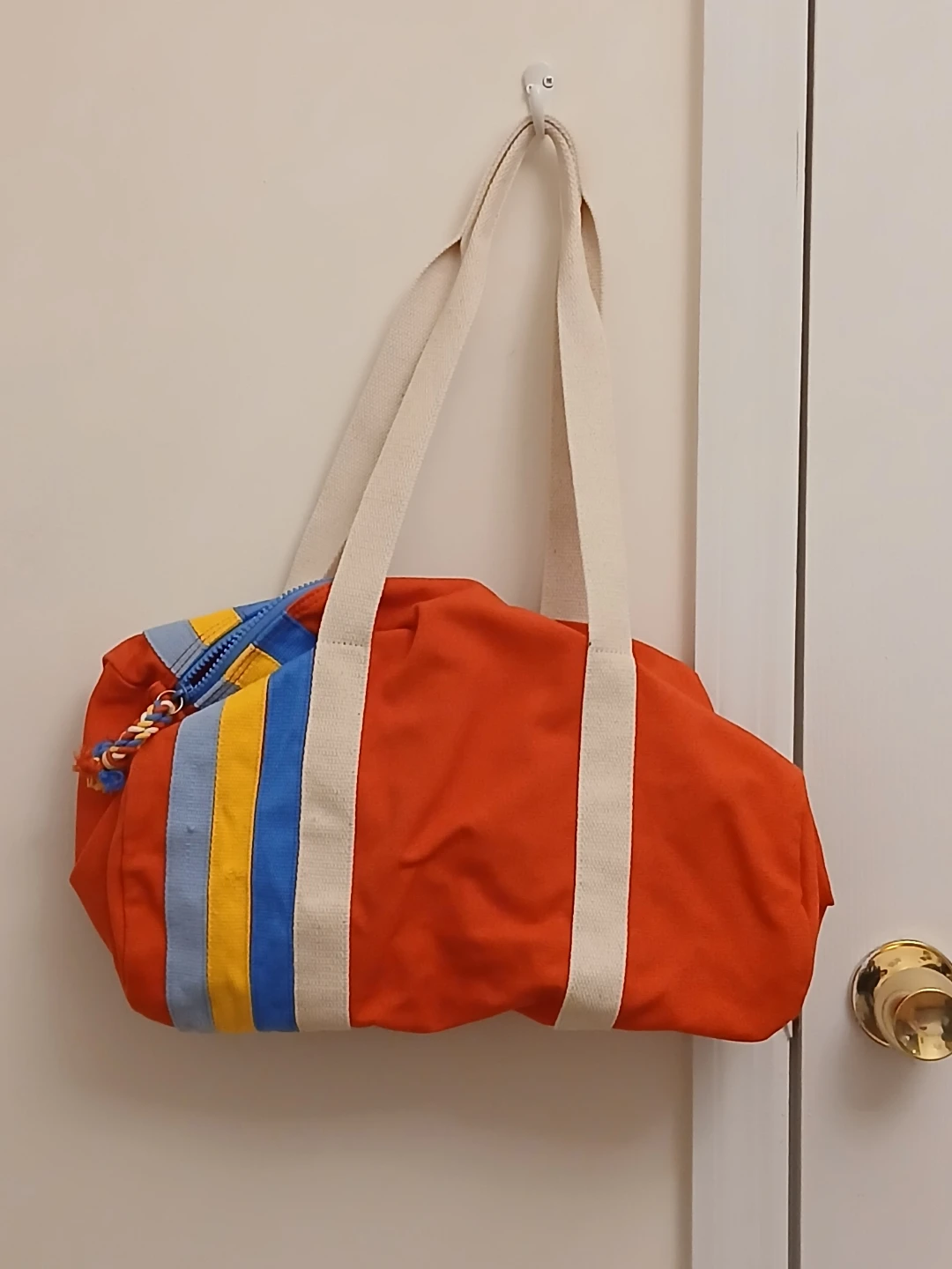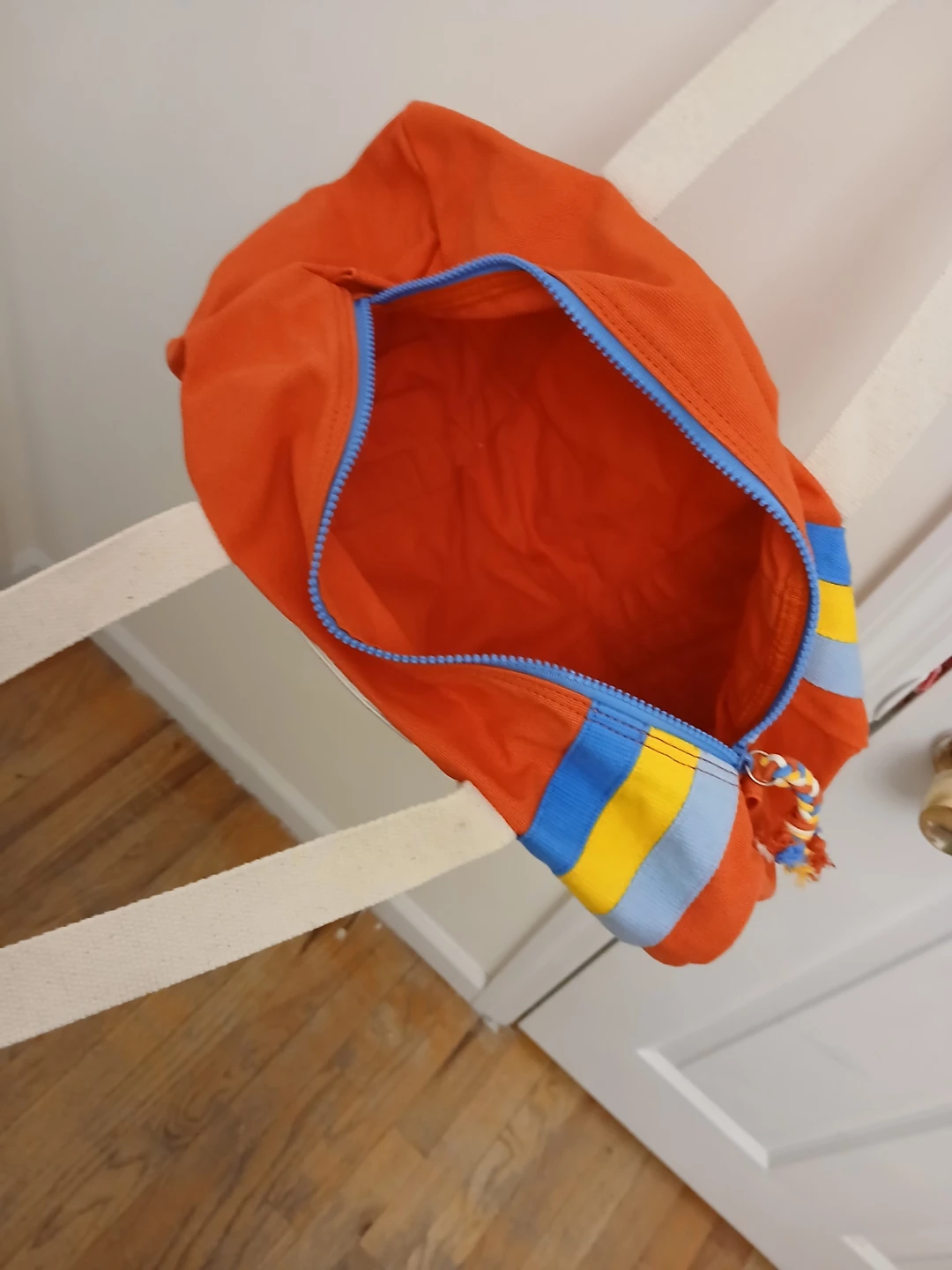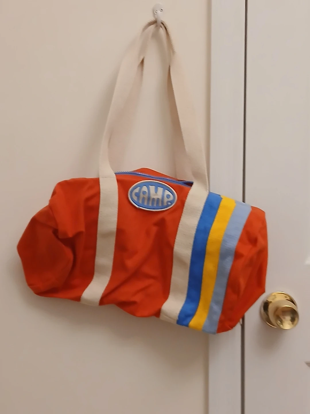I'm selling an orange duffle bag with a 'CAMP' logo. It features blue, yellow, and light blue stripes, along with white straps. The bag has a blue zipper and is in good condition!