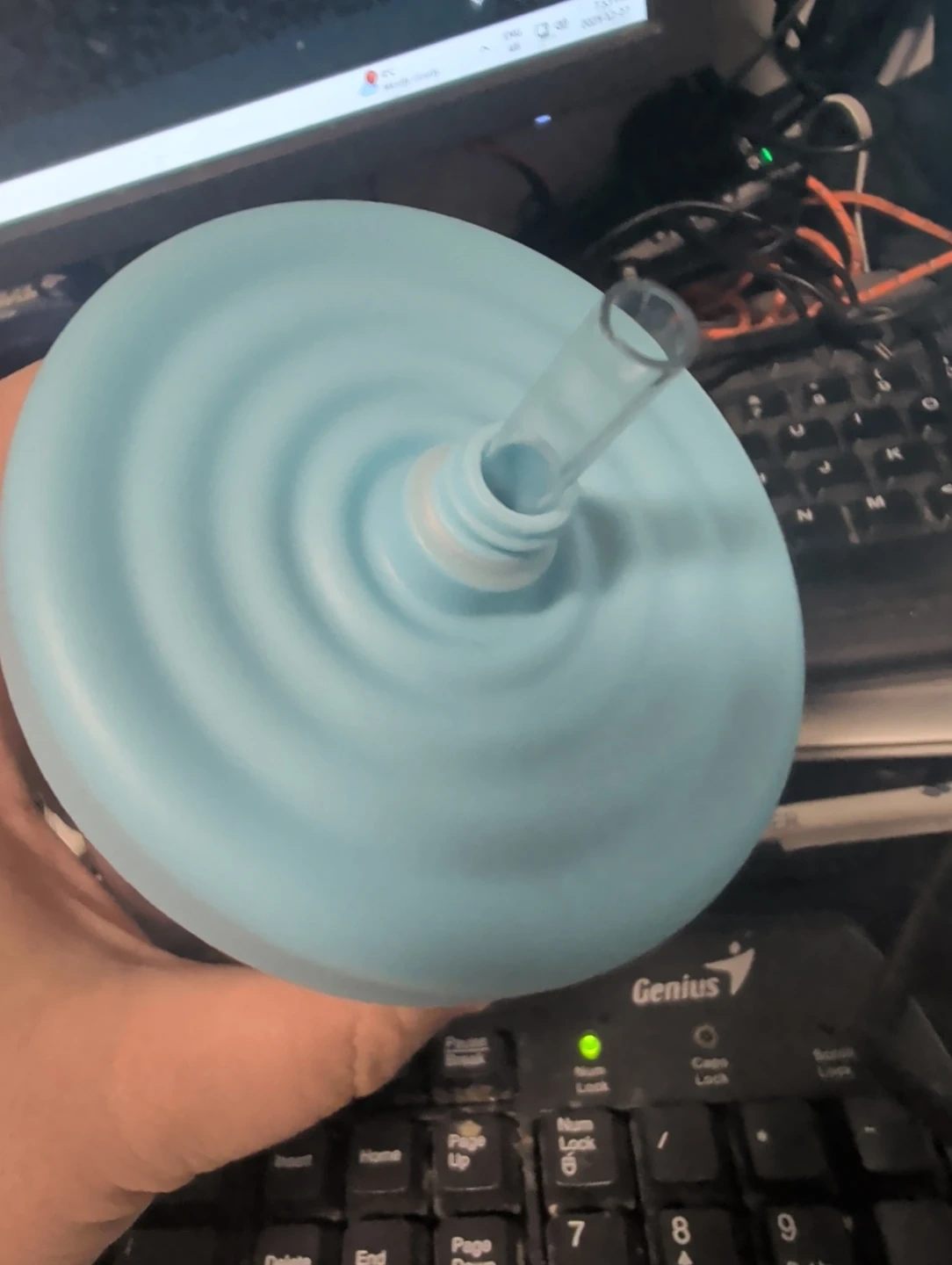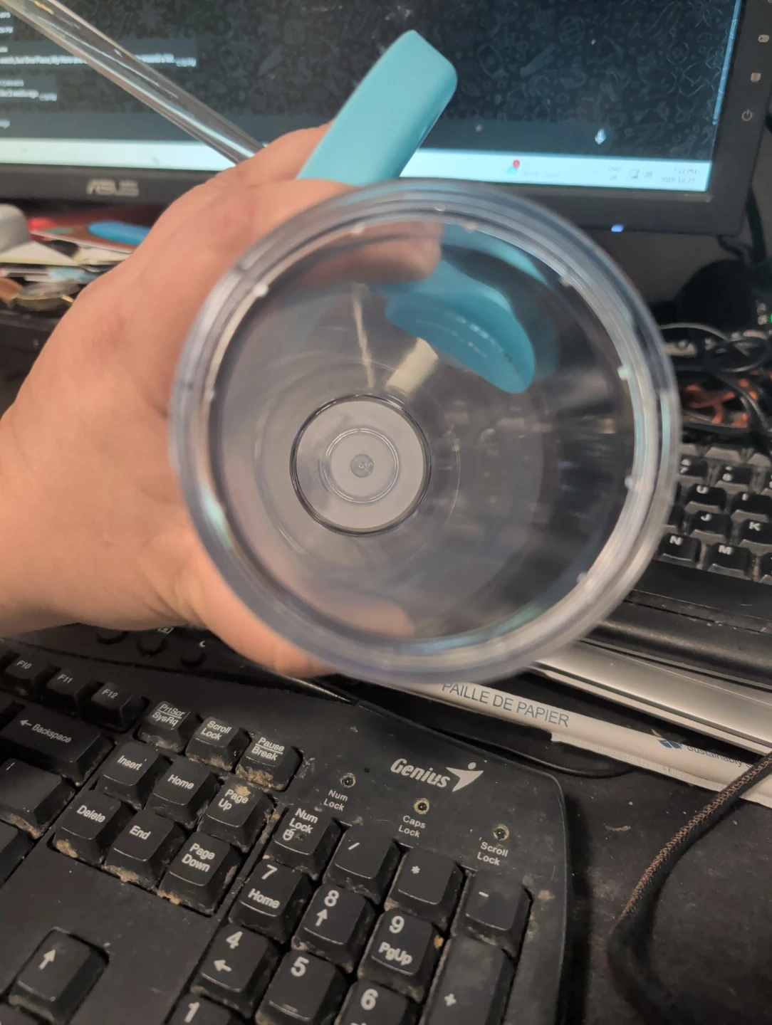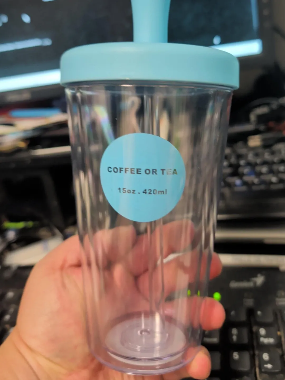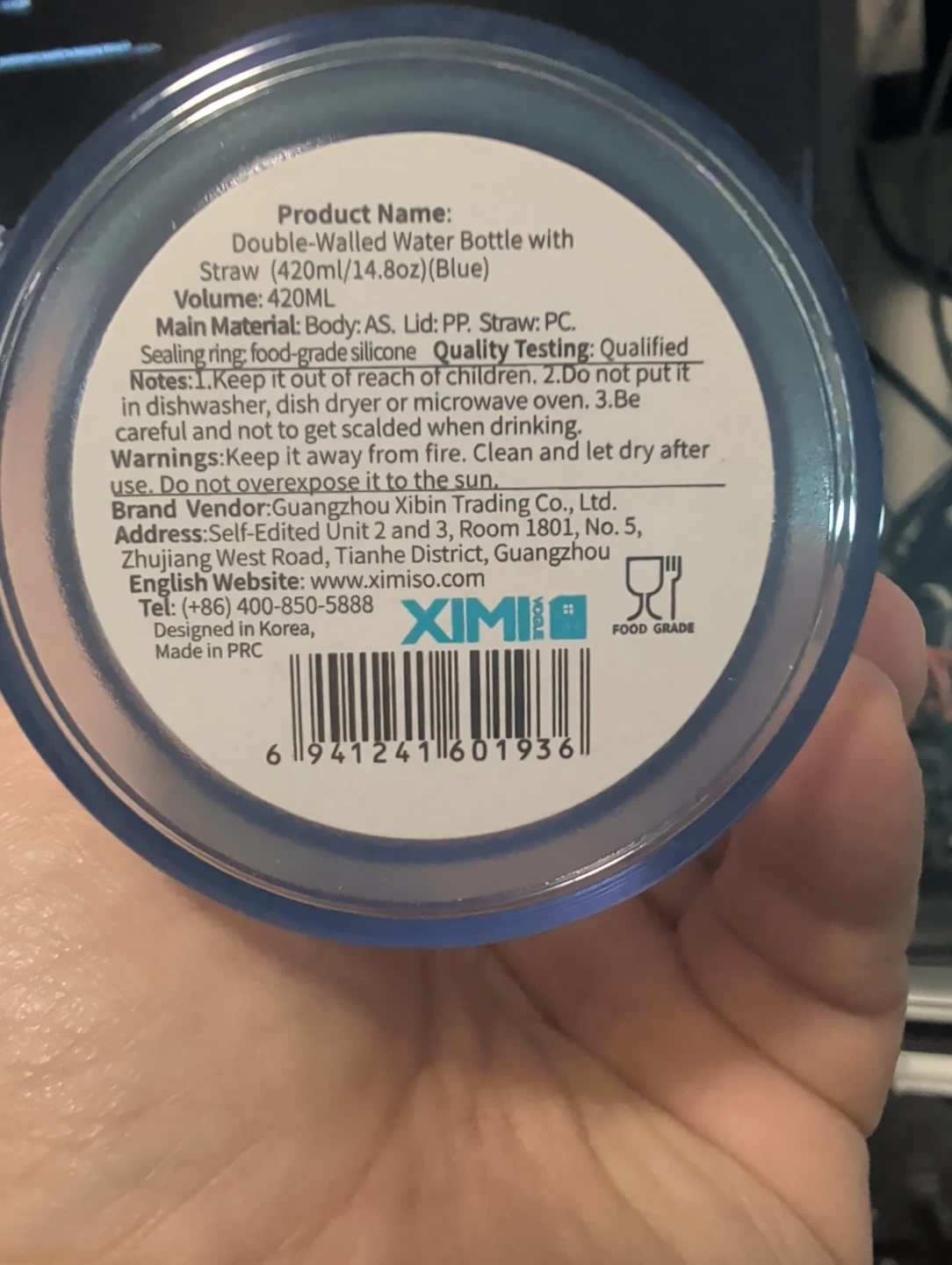 I'm selling a XIMISO double-walled water bottle with a straw. It's blue and holds 15oz (420ml). The bottle is made of AS, the lid is PP, and the straw is PC. The sealing ring is made of food-grade silicone