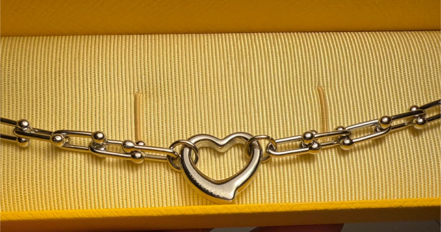 Selling a Upcycled Tiffany & Co. heart link The necklace is silver and features a heart pendant with the Tiffany & Co. logo engraved on it. It's in great condition and ready to be worn and enjoyed