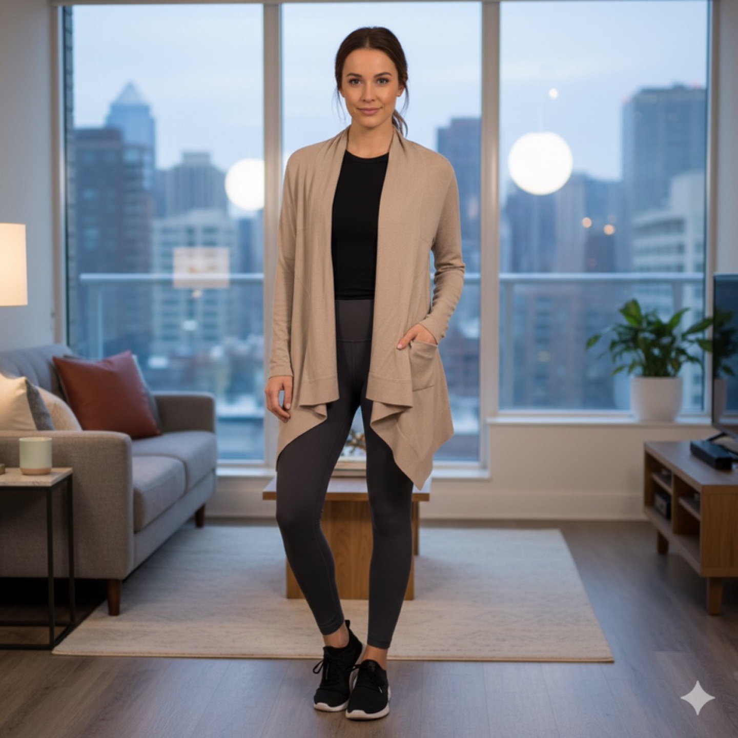 This is a "lifestyle" piece rather than a performance piece. It’s intended to be layered over yoga gear after a class or paired with jeans/trousers for a polished everyday look.