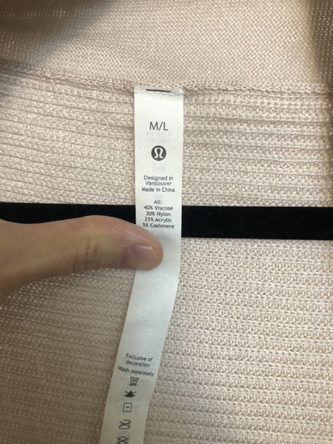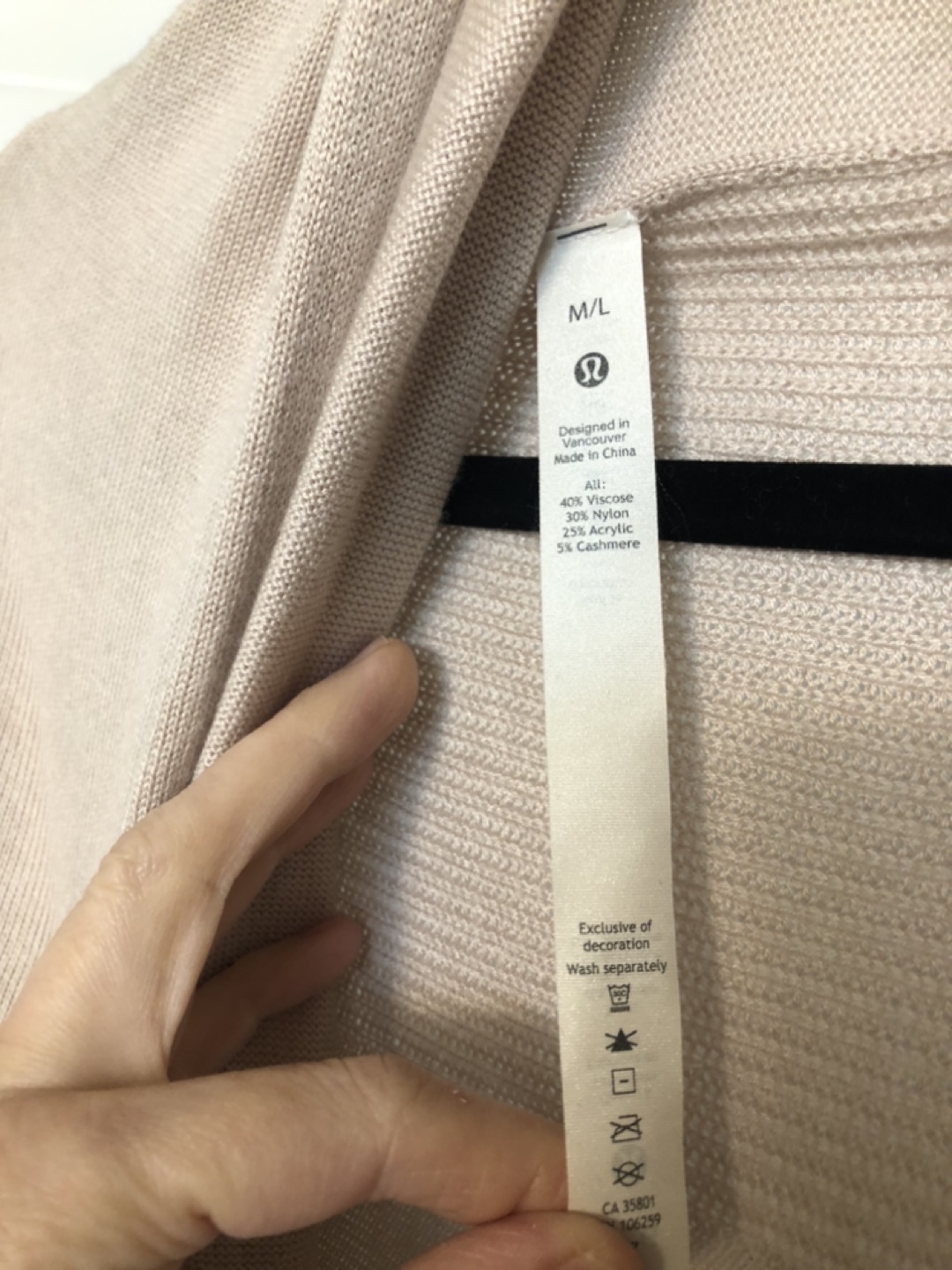 the Lululemon Cashlu Knit Textured Wrap, designed for "office, travel, and commute." It is known for its draped, open-front silhouette and cozy feel.