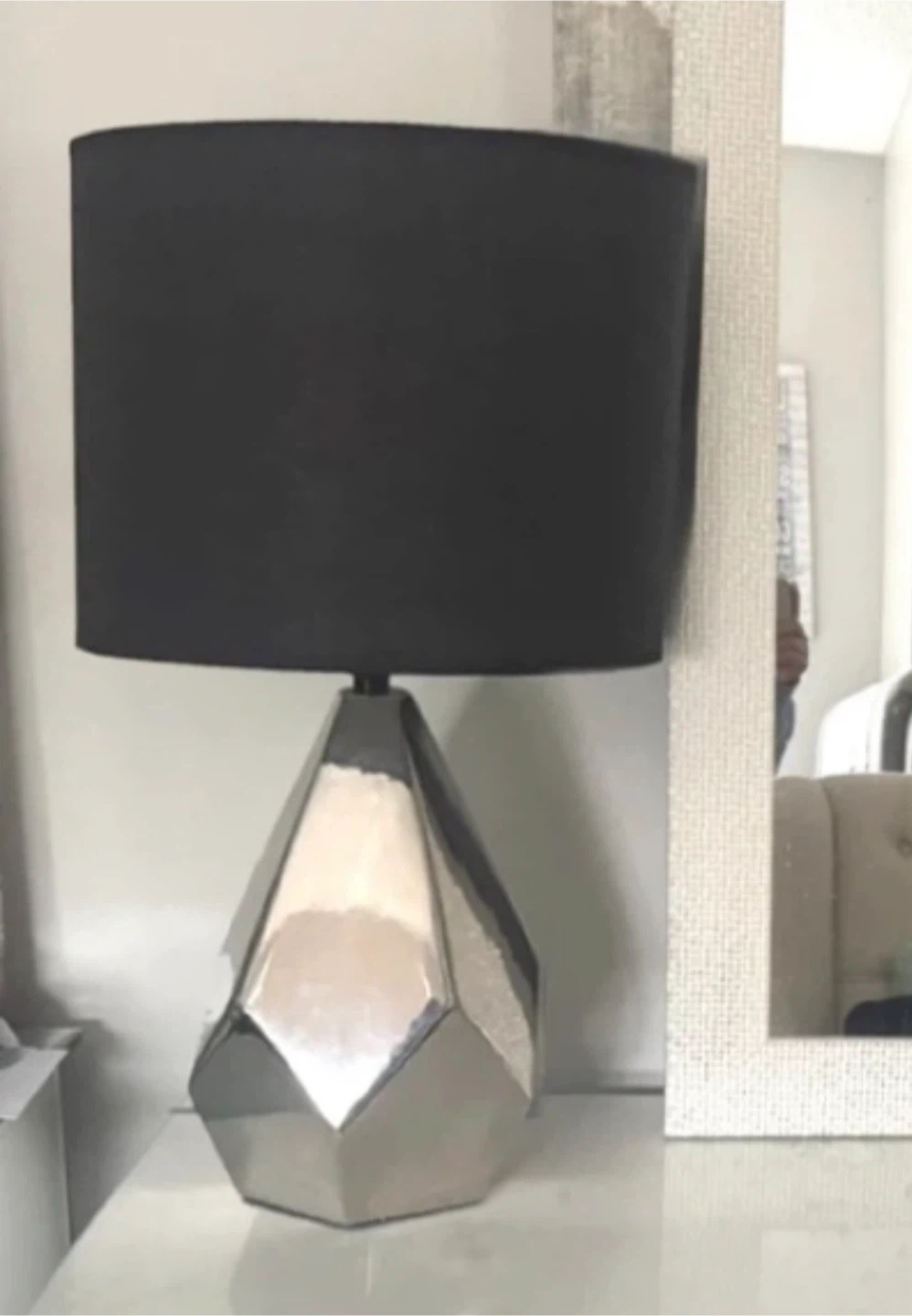 Selling a modern table lamp featuring a geometric silver base and a sleek black shade. It's in great condition and would add a touch of elegance to any room. I will give with a working bulb.