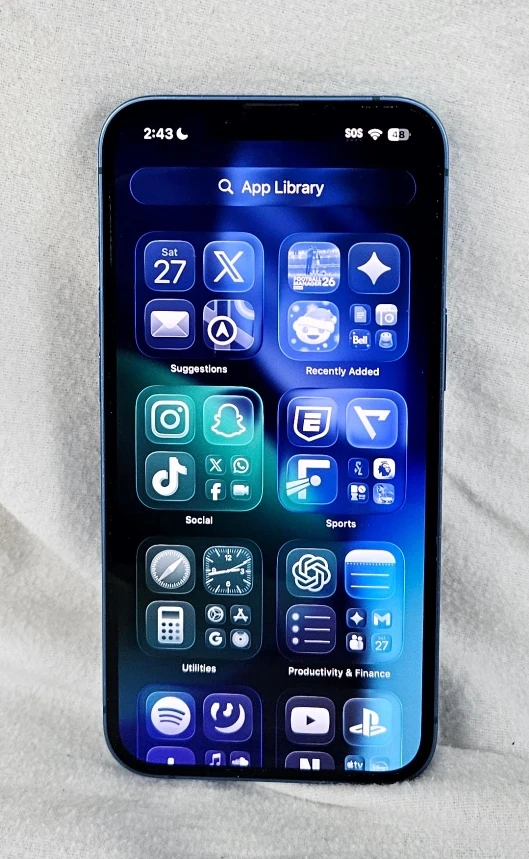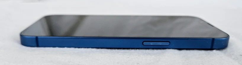 An Apple iPhone 13 case (blue), a lighting cable, power adapter and original box are all included.