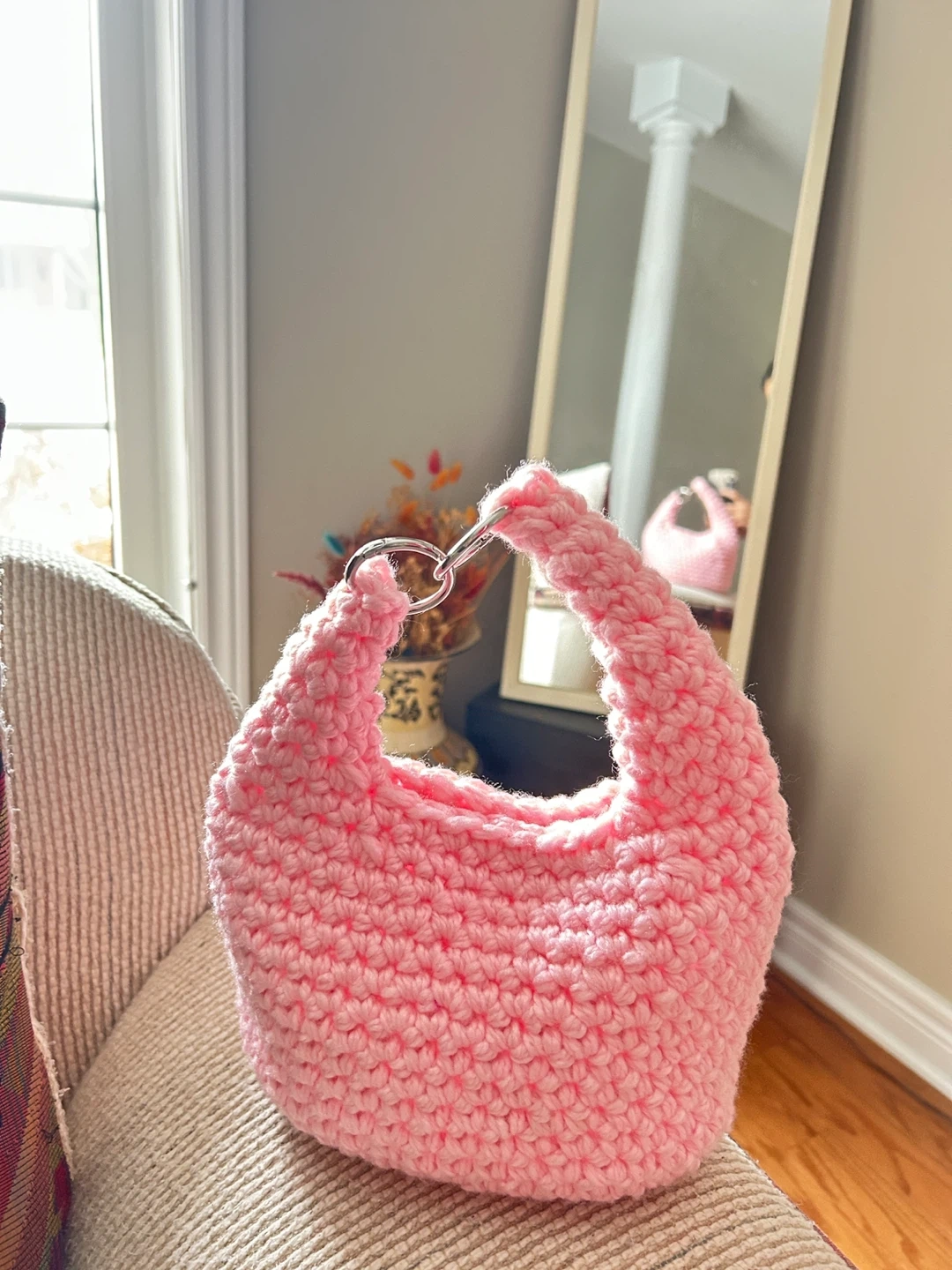 Selling a cute, handmade pink crochet handbag! It's a unique piece with a silver ring detail on the handle. Perfect for adding a pop of colour to your outfit and carrying your essentials