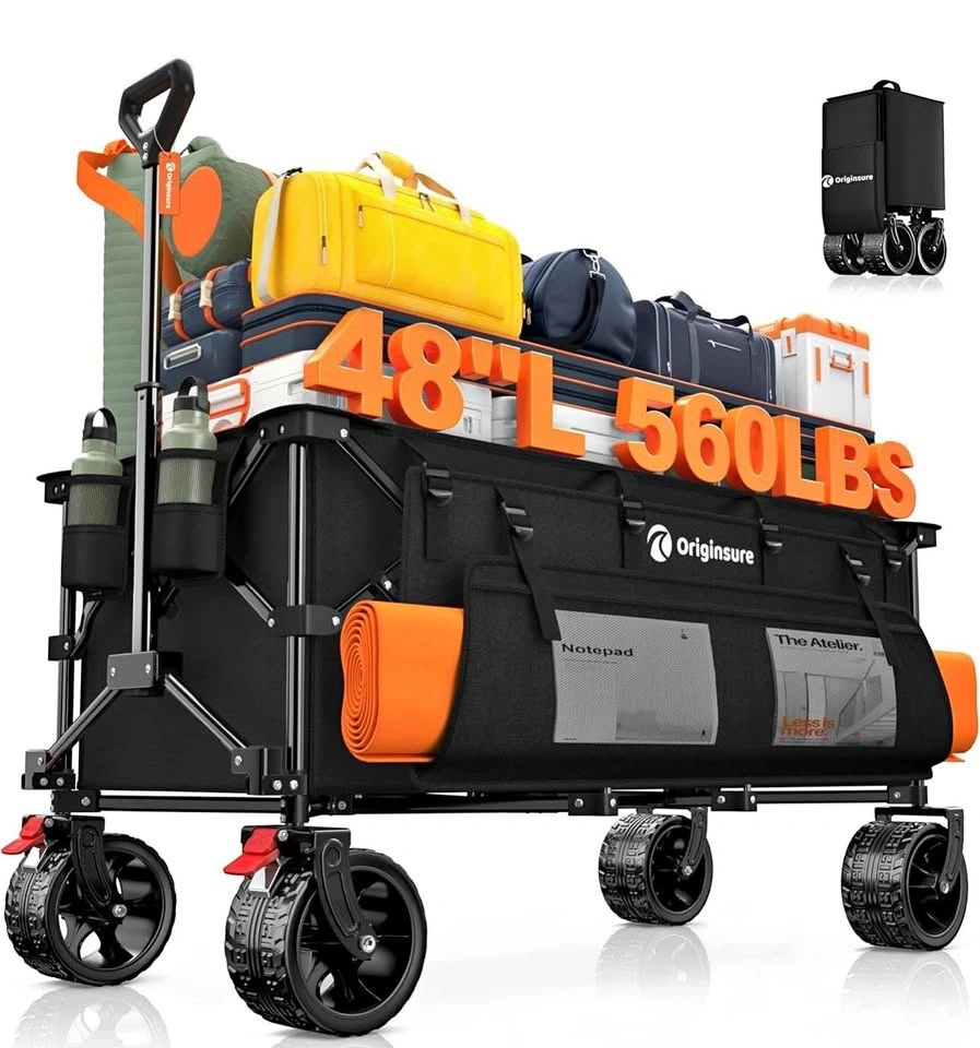 48” heavy-duty collapsible wagon with 300L capacity and 560 lb load limit. Big all-terrain wheels. Perfect for beach, camping, groceries, and sports.