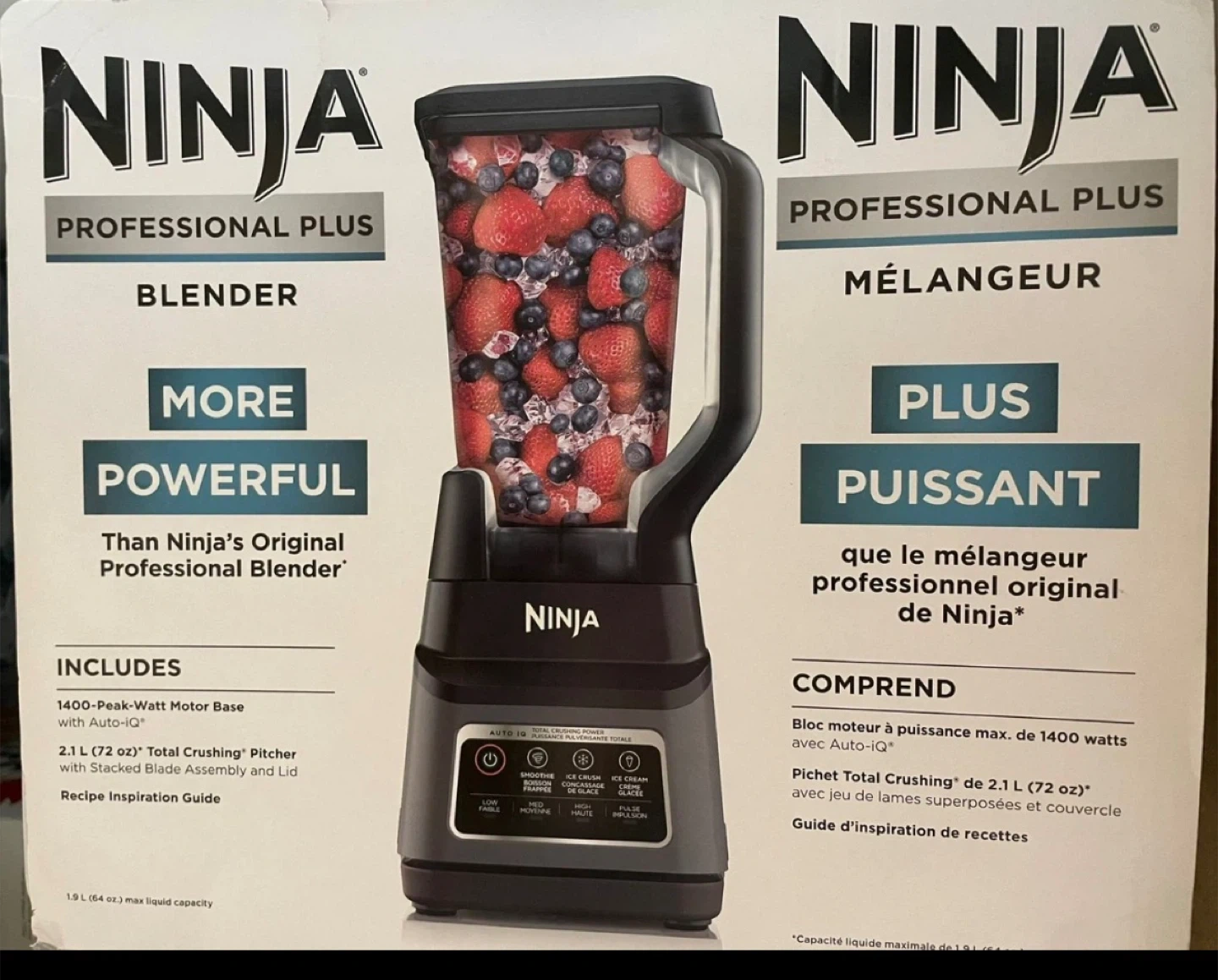 Selling a Ninja Professional Plus Blender. It comes with a 1400-Peak-Watt Motor Base and Auto-iQ. Also included is a 2.1 L (72 oz) Total Crushing Pitcher with Stacked Blade Assembly and Lid and a Recipe Inspiration Guide. The blender is more powerful than Ninja's original professional blender!