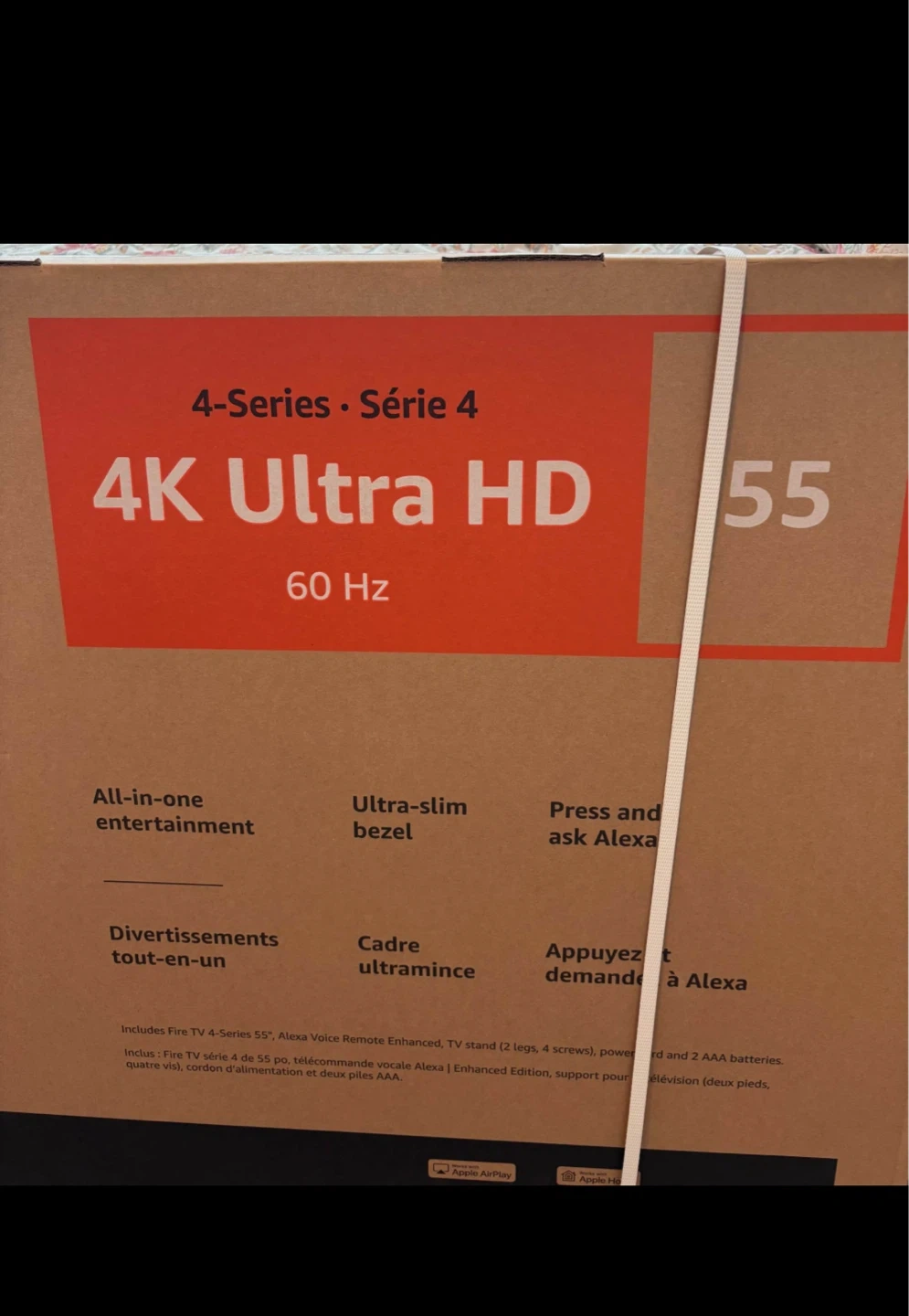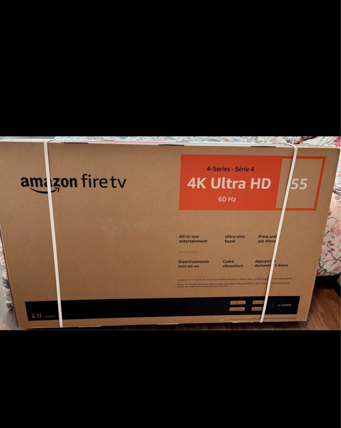 Selling an Amazon Fire TV 4-Series 55" 4K Ultra HD TV. It has an ultra-slim bezel and comes with the Alexa Voice Remote. The box includes the TV stand (2 legs, 4 screws), power cord, and 2 AAA batteries