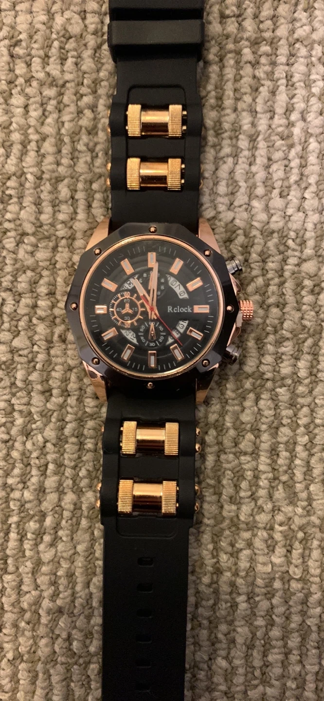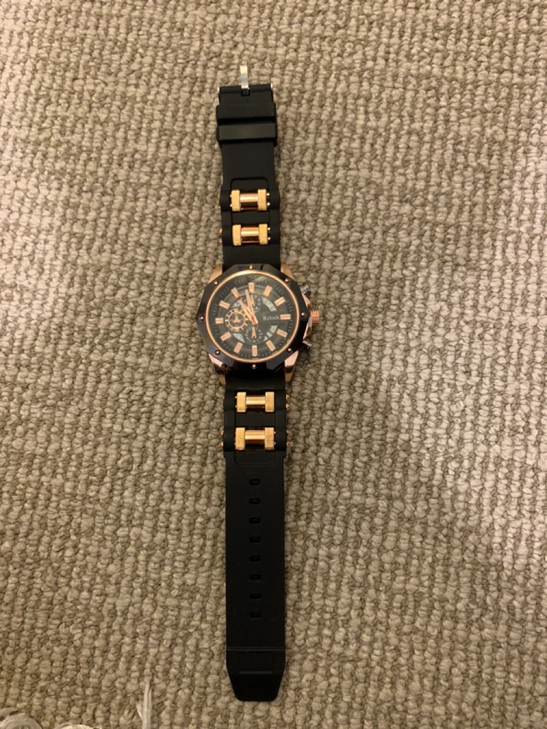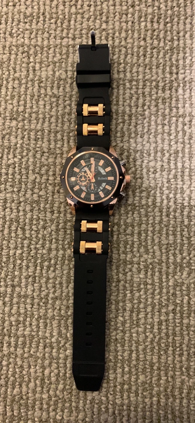 Selling a Relock men's watch with a black band and striking gold accents. It's a stylish timepiece that's sure to catch the eye!