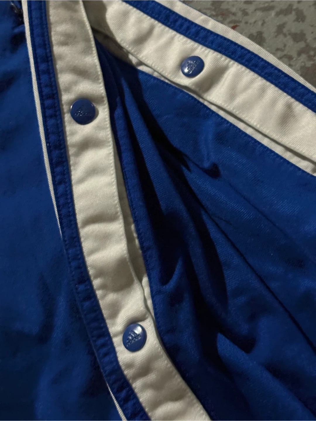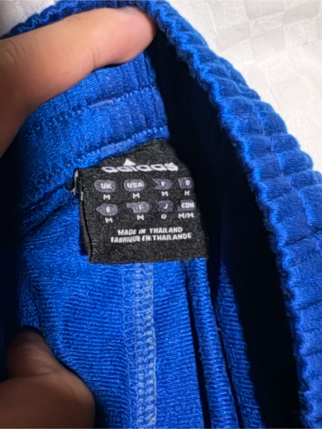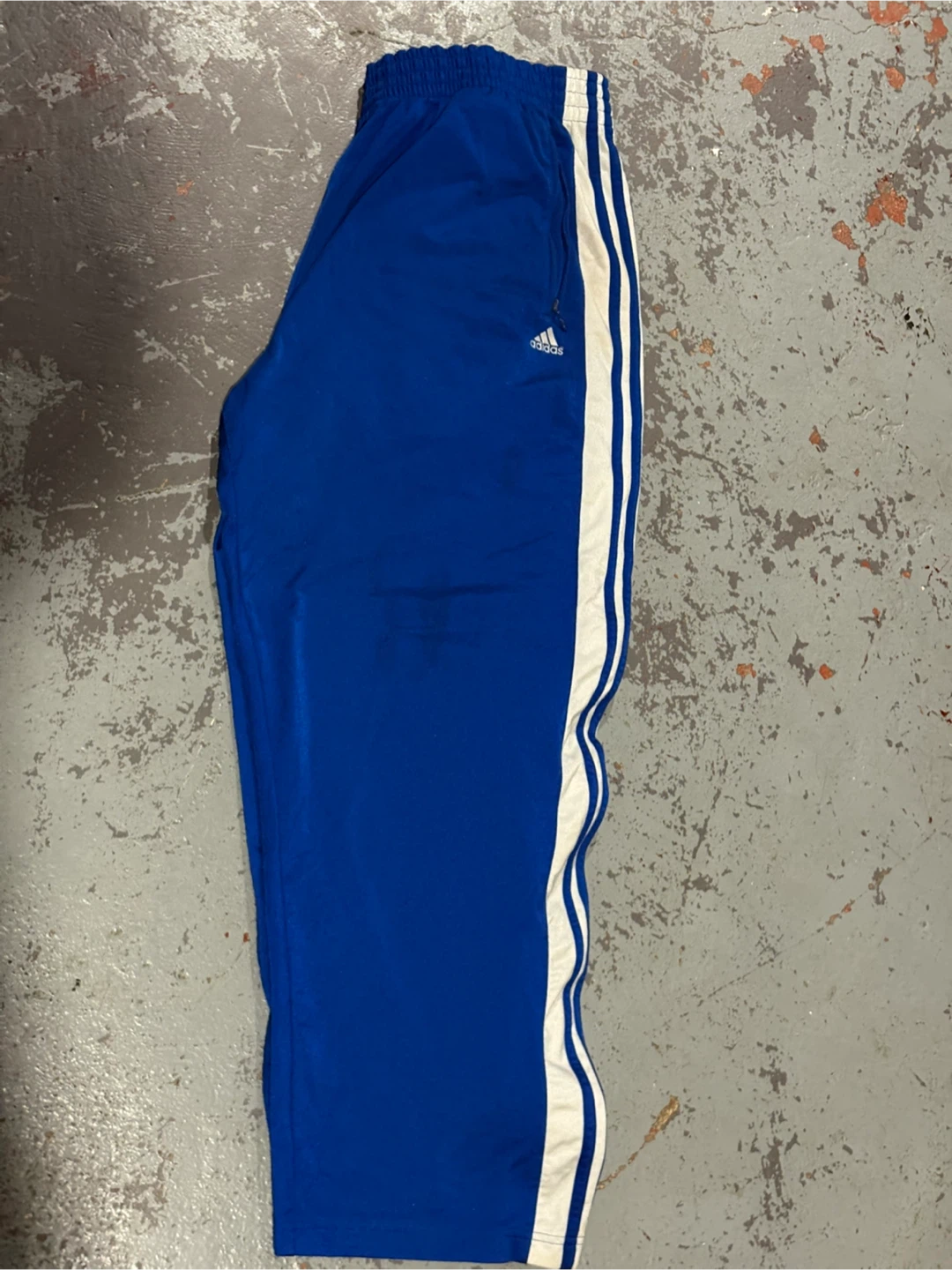 Selling a pair of Adidas track pants in blue with white stripes! They're a size medium and in great condition. Perfect for workouts or just lounging around!