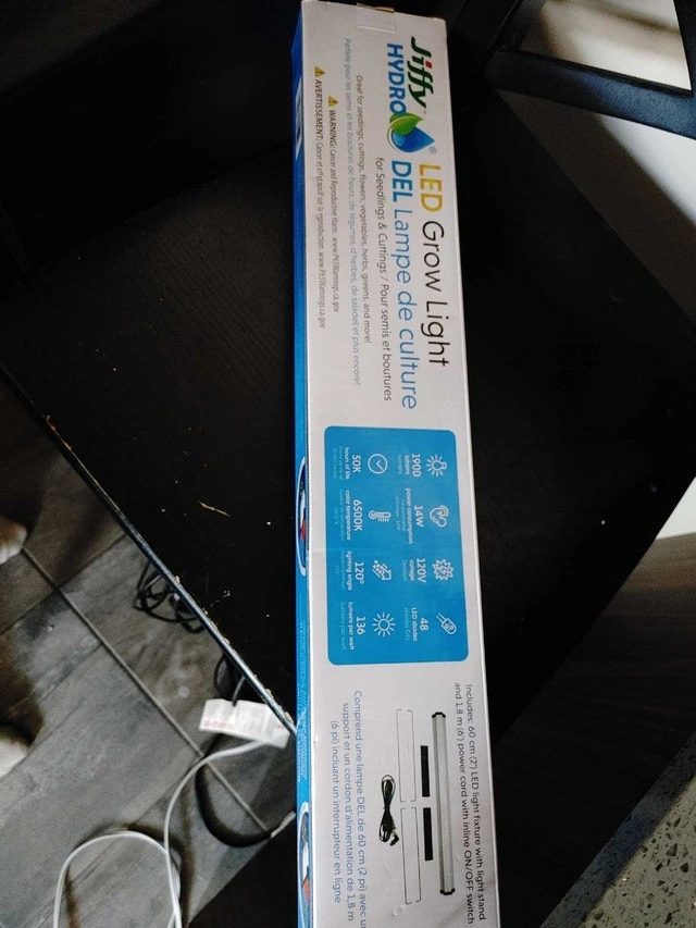 I have a unused brand new still in the original box Jiffy LED grow light. It comes with 48 LED diodes instead of the tubular fluorescent light. P. S I've attached multiple lights together to give more light power.... 1900 lumens 14w power consumption 120v voltage 48 Led diodes 50k hours of light 6500k color temperature 120° lighting angle 136 lumens per watt Includes: 60cm 2' led light fixture with light stand, can be flipped around to hang from ceiling, 1.8 m 6' power cord with inlineON/Off switch. Feel free to message if you have any questions!