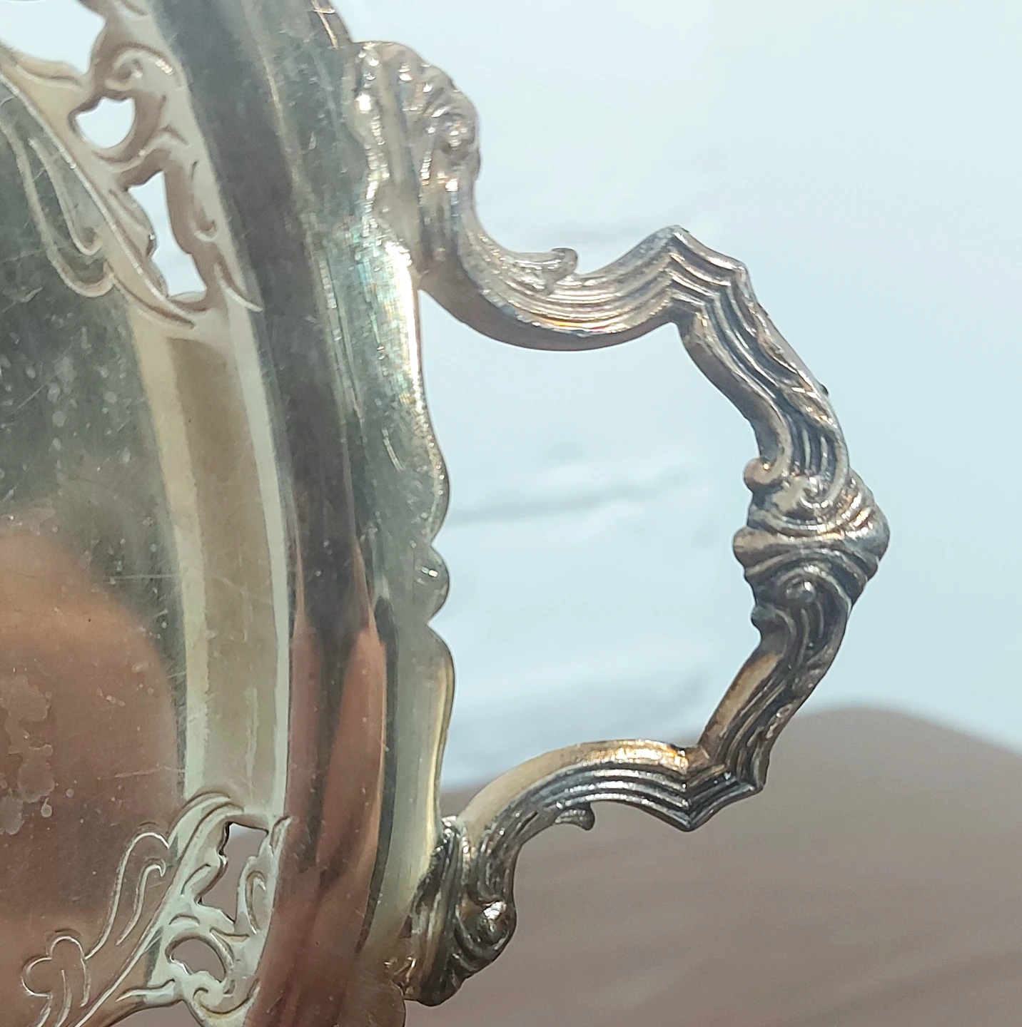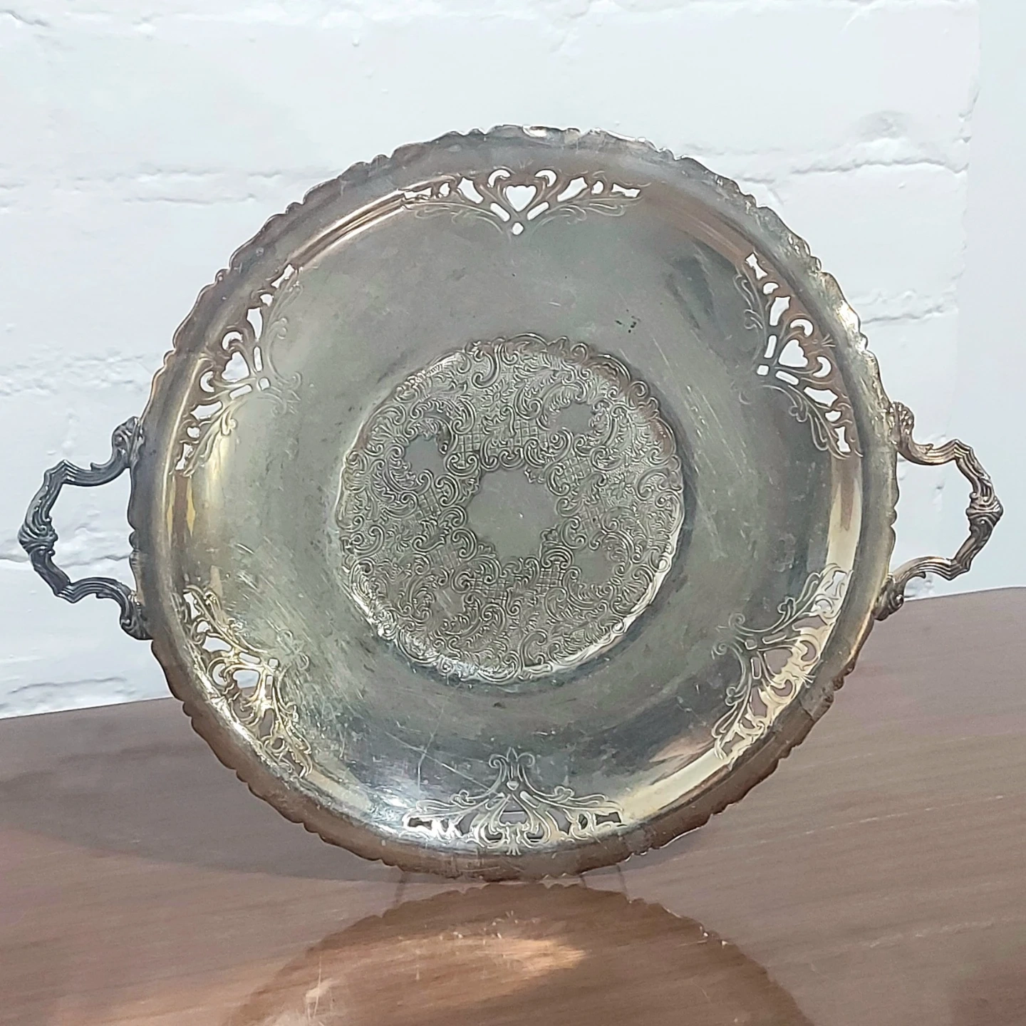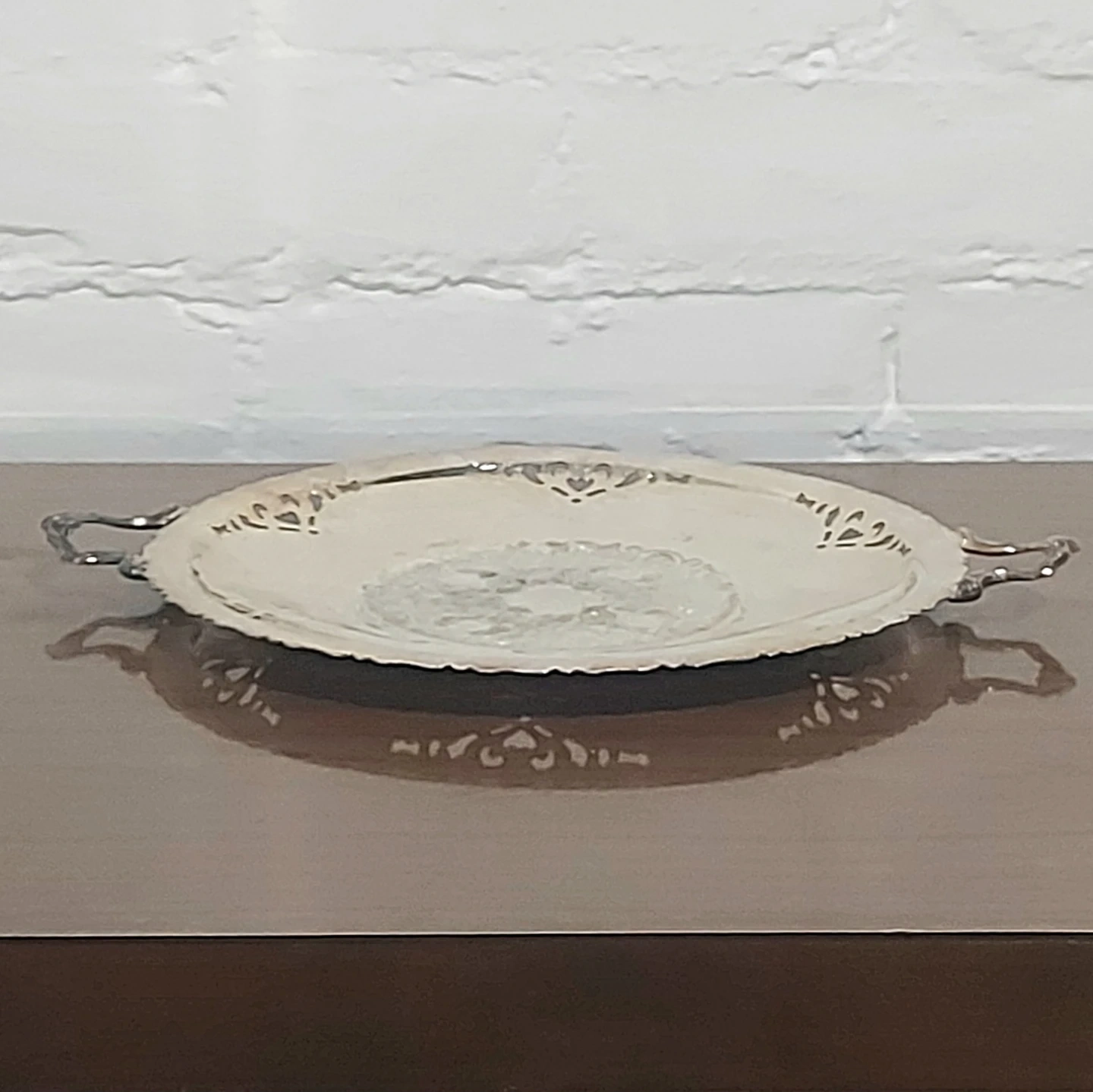 Suitable for home/room decor, as a tray for jewelry/perfume/cosmetics, or for seasonal decor and center pieces. Measures 12 inches across with the handles, 9.5 inches across without. From a pet free and smoke free home.