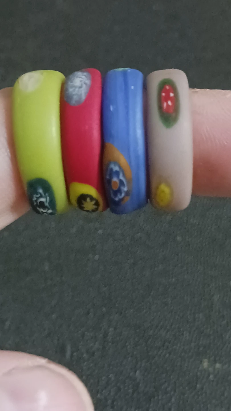 Selling a set of four colourful glass bead rings! These rings are a fun and unique accessory to add a pop of colour to any outfit. They feature different colours and floral designs on each ring. Perfect for stacking or wearing individually on the finger or with a silk scarf! Very fragile, handmade glass rings! Sold as a set!