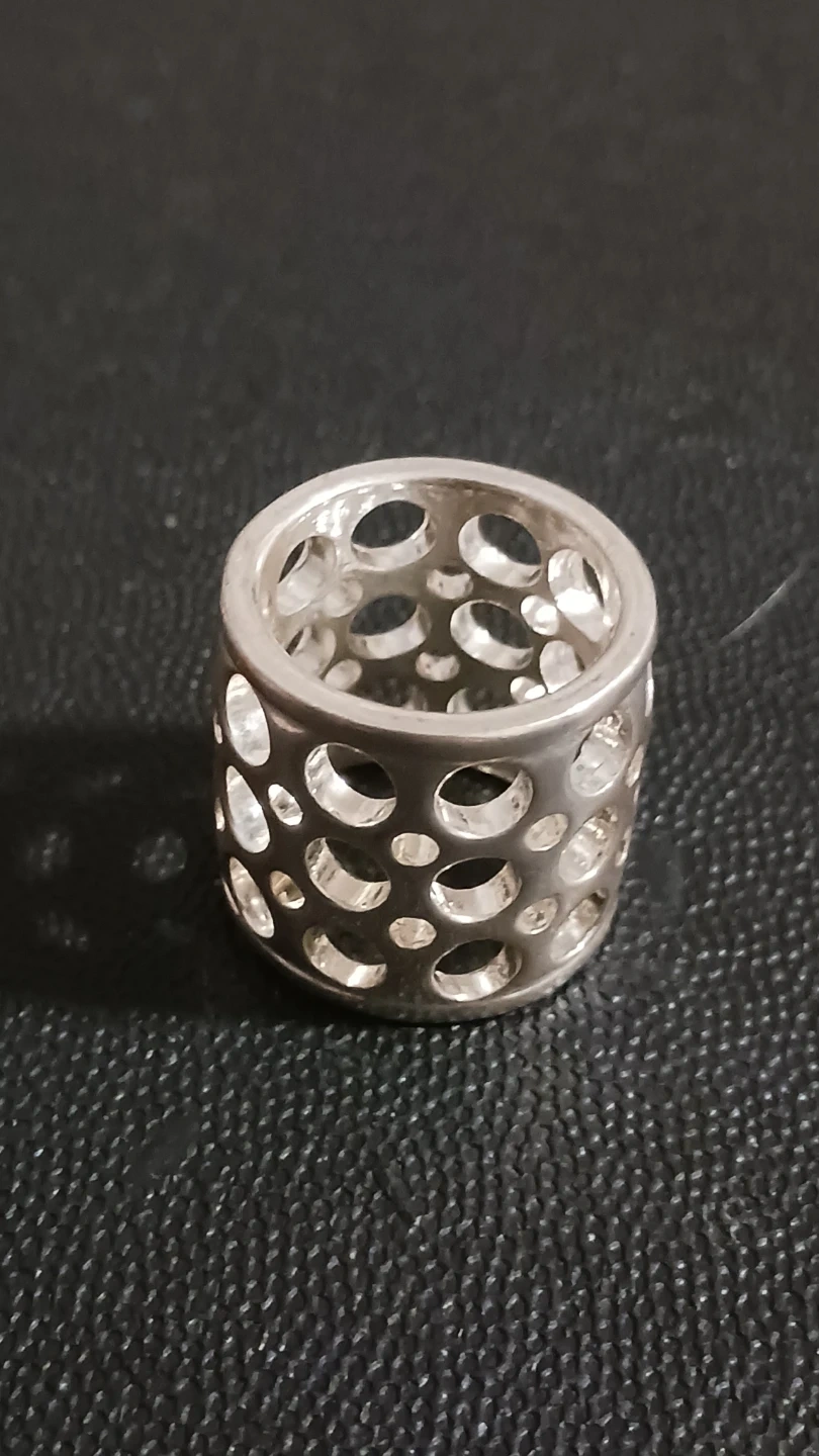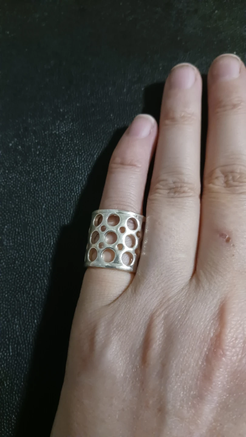 A silver plated ring with a unique design! This ring features a pattern of circular cutouts. It's in good condition and ready to wear!