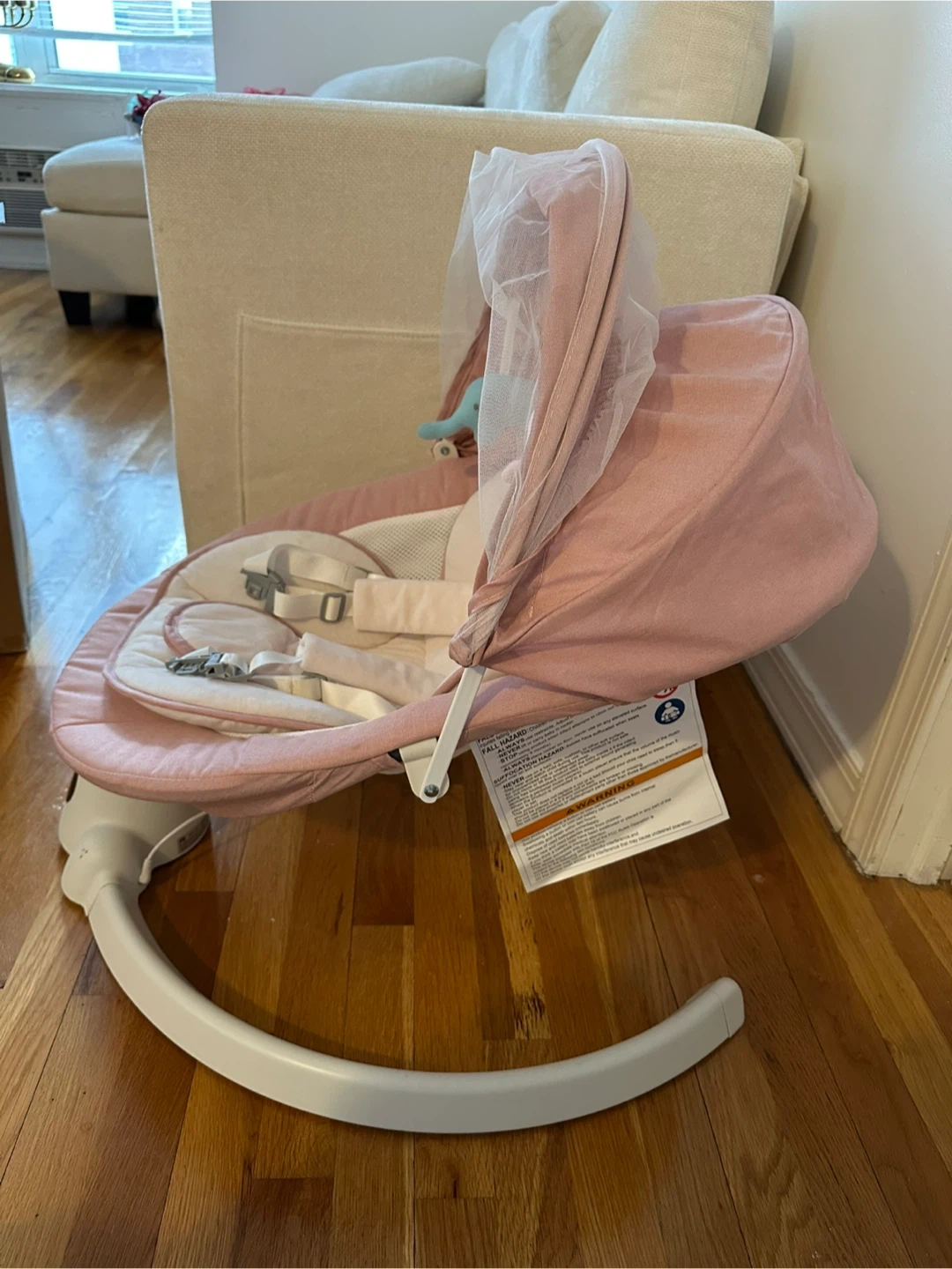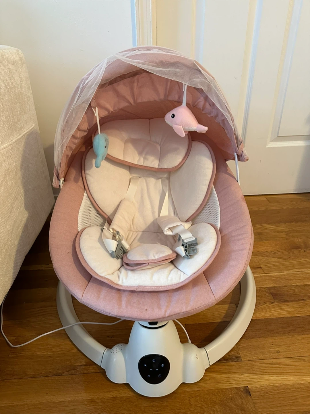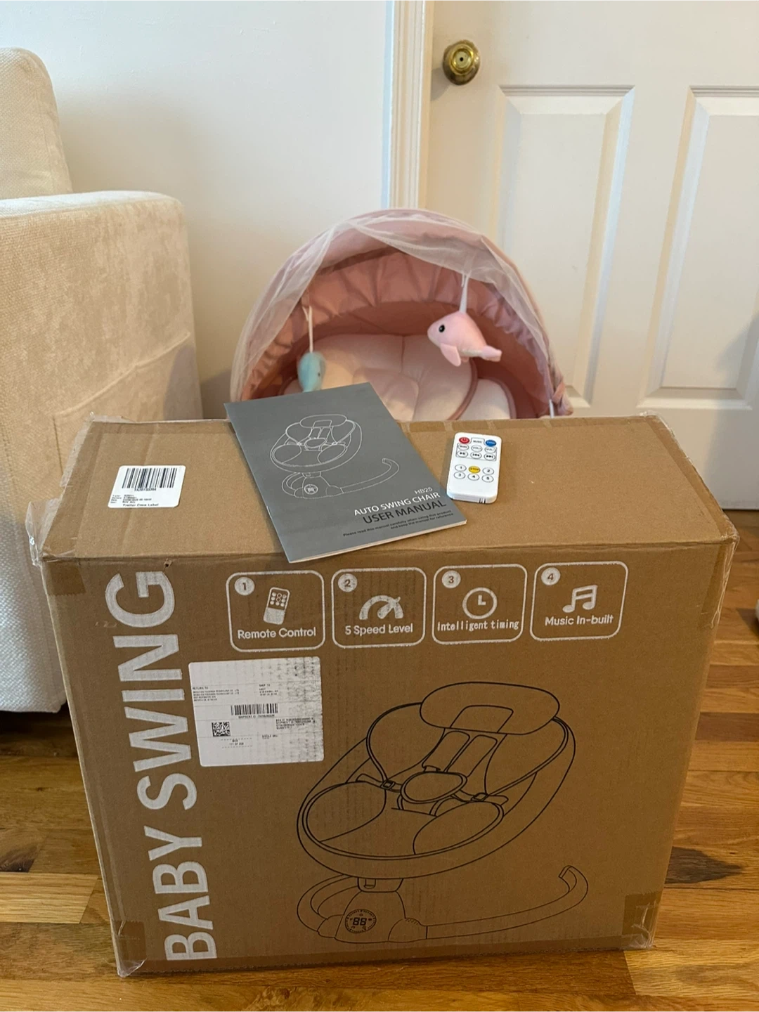 Selling a baby swing auto rocker chair in like new condition! It comes with the box and includes features like remote control, 5 speed level, intelligent timing, and built-in music. Perfect for keeping your little one comfortable and entertained.