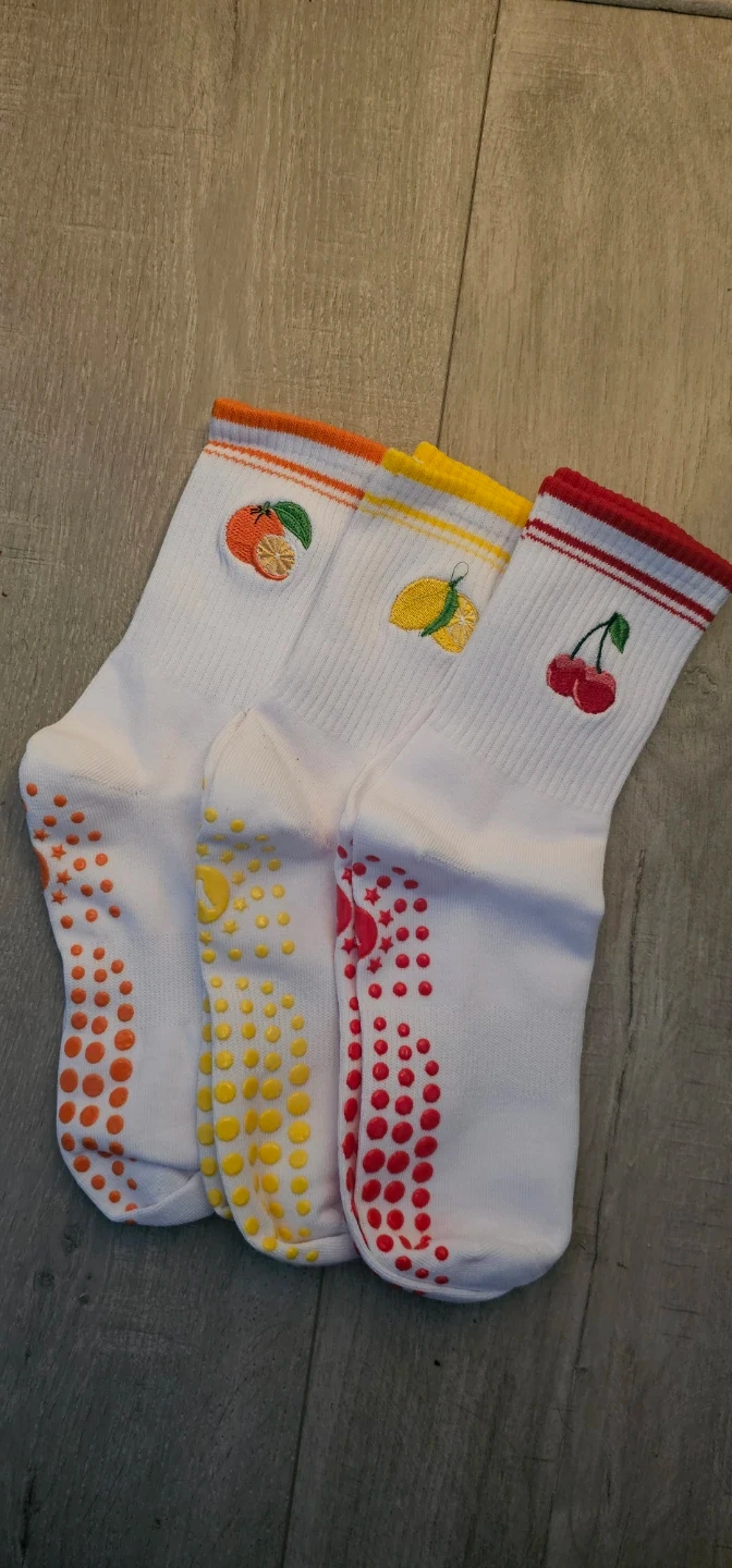 Here are three pairs of white socks, each with a different fruit embroidered on them: orange, lemon, and cherry. They also have little grips on the bottom in matching colours!
