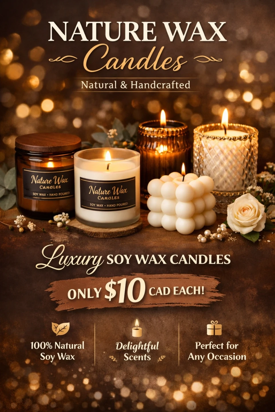 Selling these lovely Nature Wax candles! They're natural and handcrafted, made with 100% natural soy wax. Perfect for adding delightful scents to any occasion!