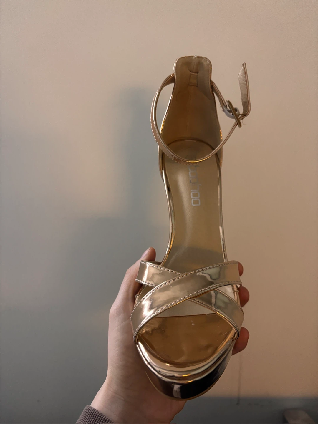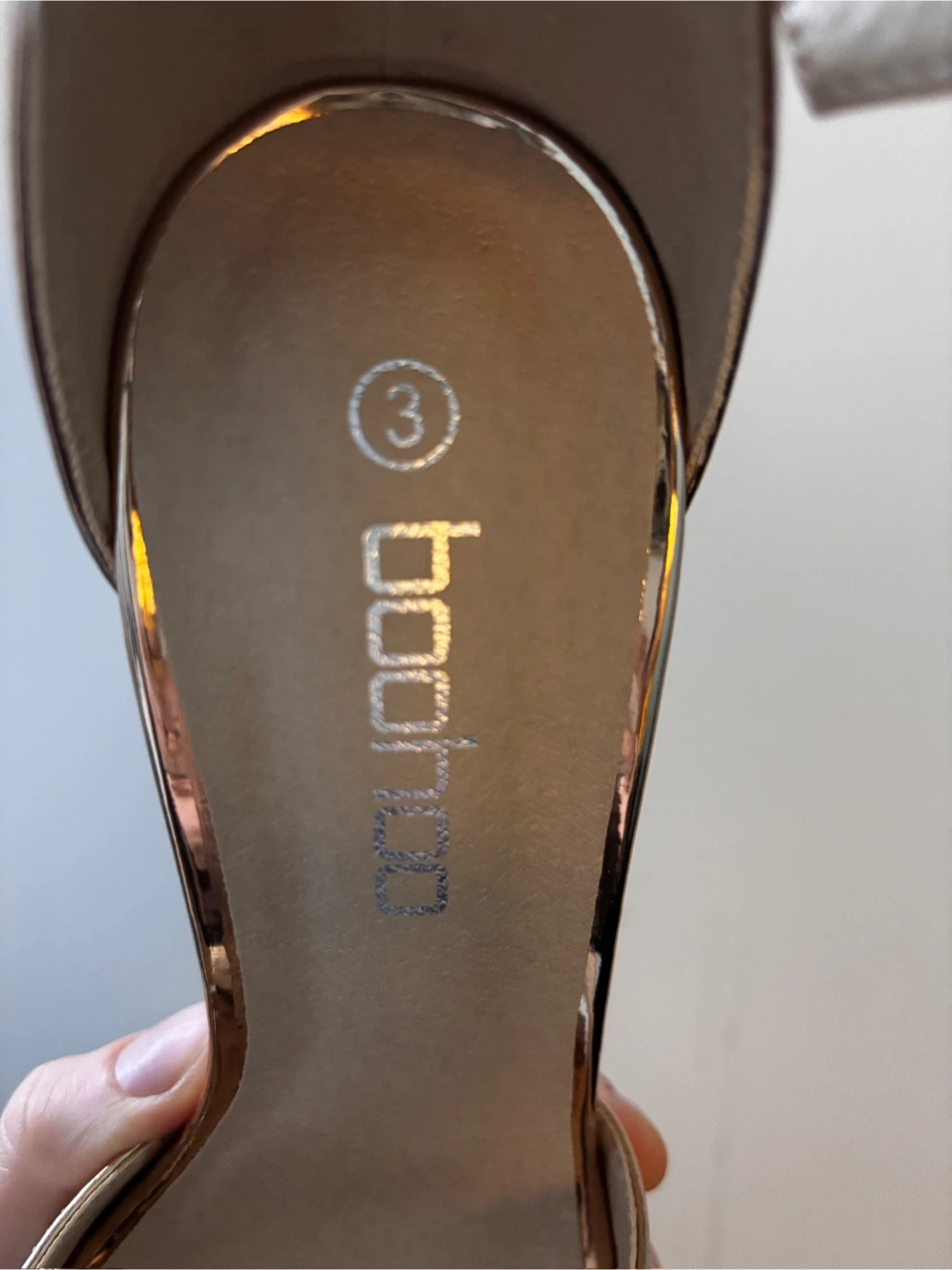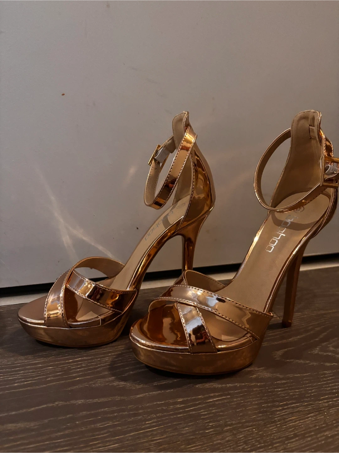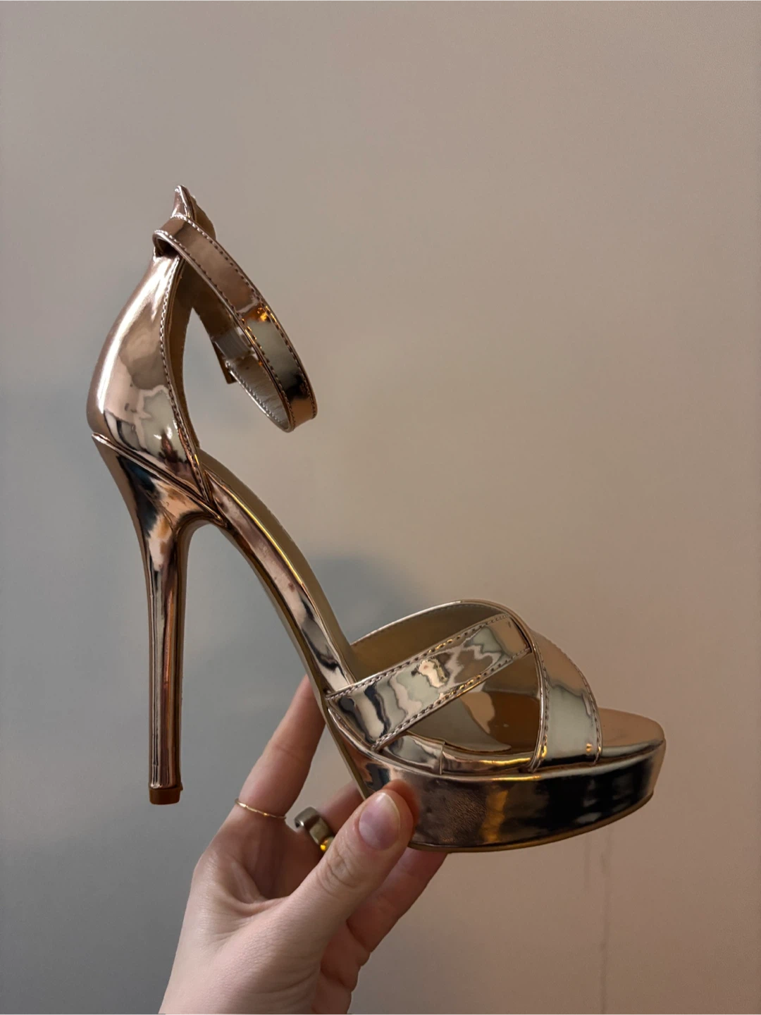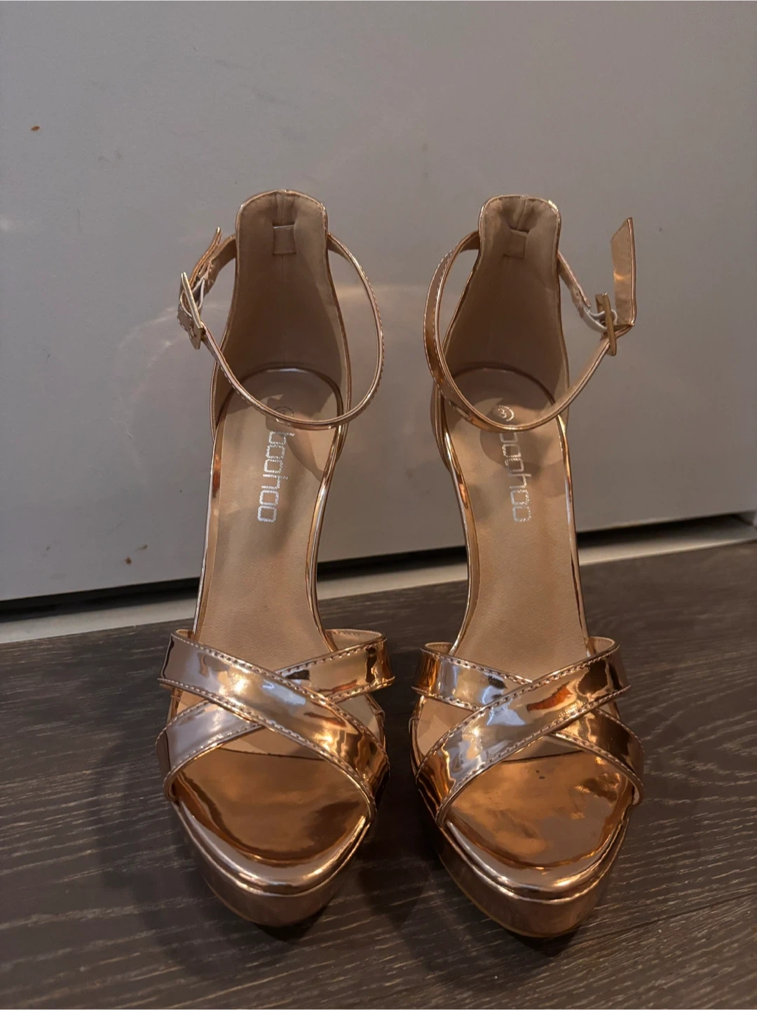 Selling a pair of Boohoo platform stiletto heels in rose gold. They've never been worn and are ready for a night out! Size 6.5/7 (European shoes so the sizing says 3)