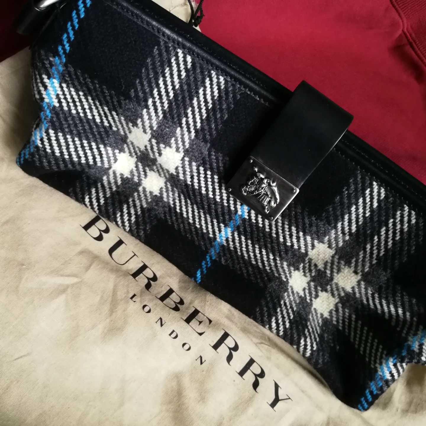 Selling a clutch with a stylish plaid design. It features black leather accents and a silver zipper. Comes with a dust bag to keep it protected! Branded as Burberry, but not sure authentic, hence the very low price.