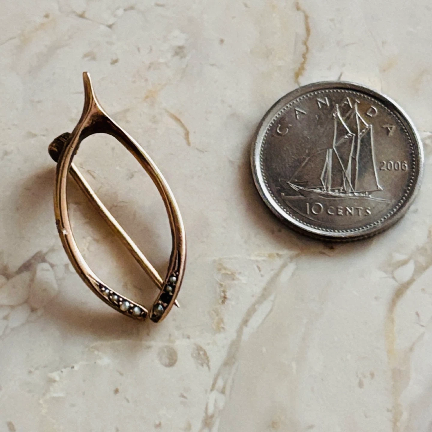 Selling a lovely vintage rose gold wishbone brooch. It's in great shape and would make a beautiful addition to any collection! The brooch has some small stones set into it. Tests at 14k. 1.324g
