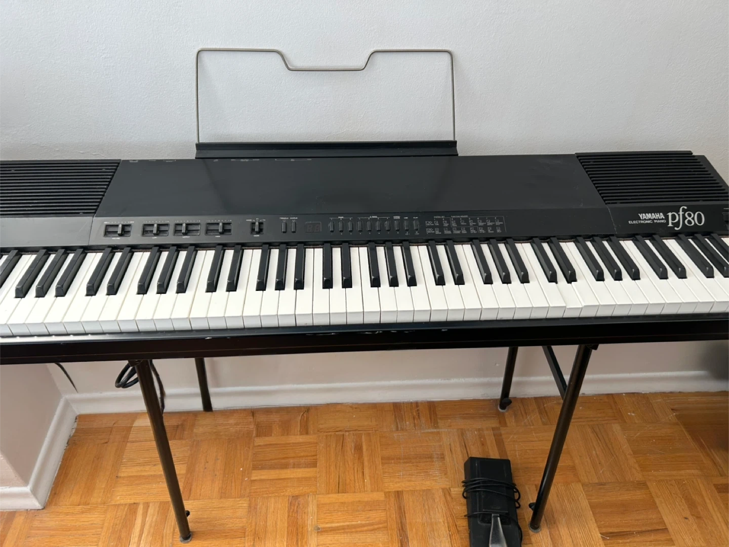 1980’s vintage 88 key electric piano. Weighted keys. Some visual blemishes, but works and sounds good. It is portable, but weighs 33.5 kg. Comes with a music book holder, heavy duty folding piano stand, and sustain peddle.