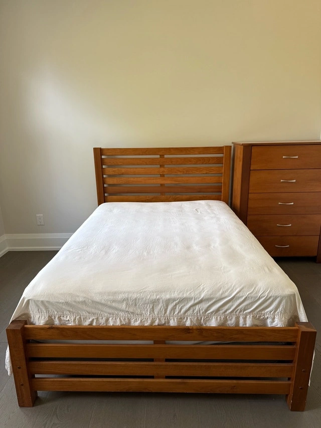 This full-size bed set includes a sturdy wooden bed frame, a matching dresser with five drawers, a desk with drawers, and a chair. It's a complete set to furnish a bedroom with a cohesive look. The set is staging furniture. Brand new. Made in Canada. Sale in one set. Full size mattress is available with extra cost. Just so we're clear, though, if this ad is still up, the bed set is still available.