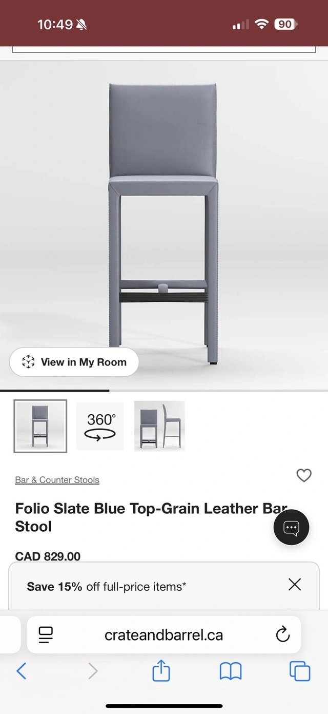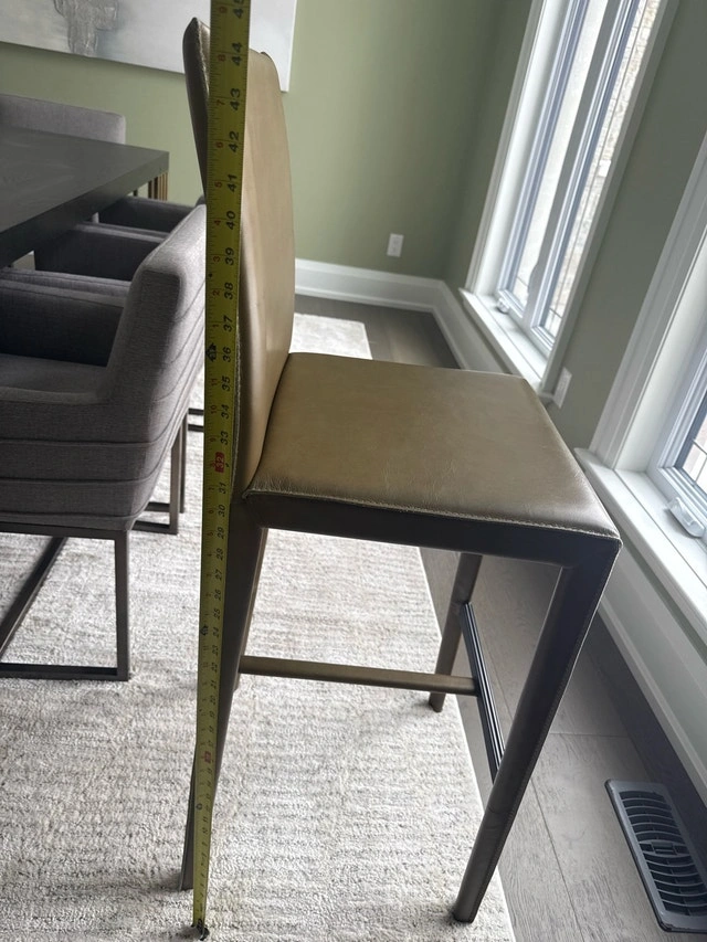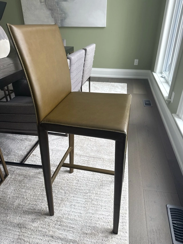 $600 for each. Pull up to the bar on our sleek, comfortable stool with reinterpreted Italian design inspiration, clean Parsons-style lines and luxe leather upholstery. Fully wrapped in top-grain leather in slate blue, the Folio bar stool is finished with neat mitered corners, flange seaming and stitched construction that have helped make it a customer favorite. High on style yet serious about comfort, the stool invites with a foam-cushioned seat and subtly curved back. A grooved footrest features a protective cover. The Folio Top-Grain Leather Bar Stool is a Crate and Barrel exclusive. By choosing FSC ®-certified furniture, you are supporting responsible management of the world's forests. FSC ®-certified plywood and steel frame Top-grain, semi-aniline leather Mitered corners, flanged edges and stitched leather construction Grooved footrest with protective cover Learn more about natural leather characteristics Features FSC ®-certified wood from forests that are responsibly managed to be environmentally sound and socially beneficial Imported