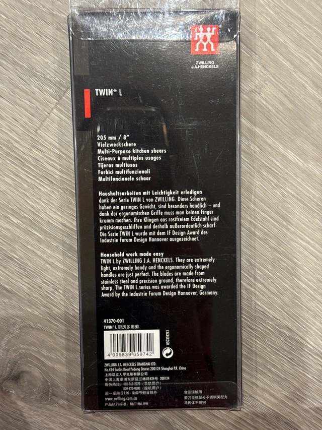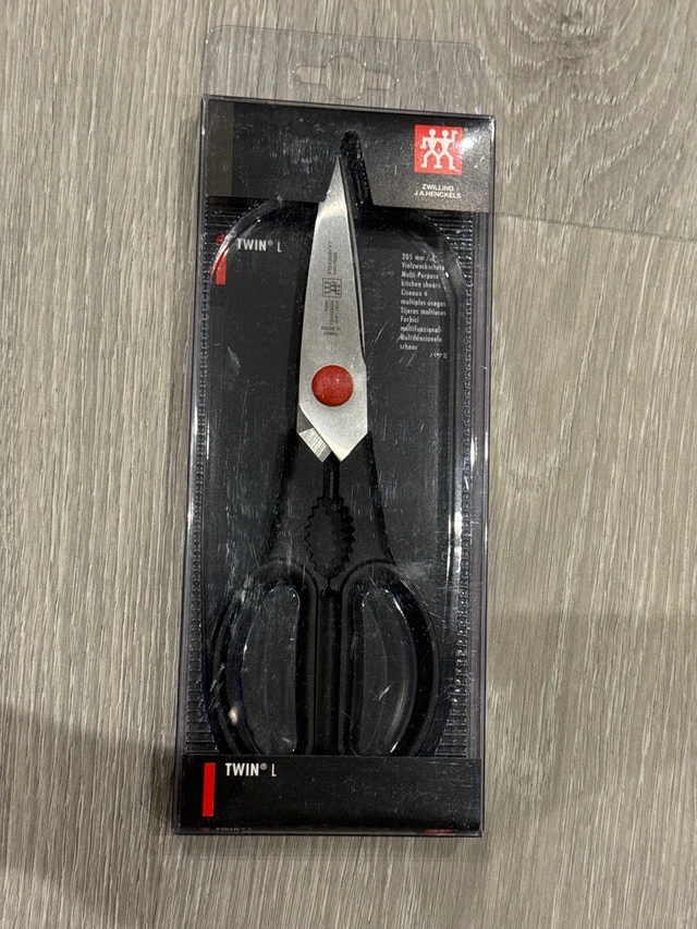Brand new pair of Zwilling J.A. Henckels Twin L multipurpose kitchen shears, 205 mm / 8". These shears are extremely sharp, with precisely ground blades made from stainless steel and ergonomically shaped handles. They are new in box, perfect for any kitchen tasks requiring precision cutting.