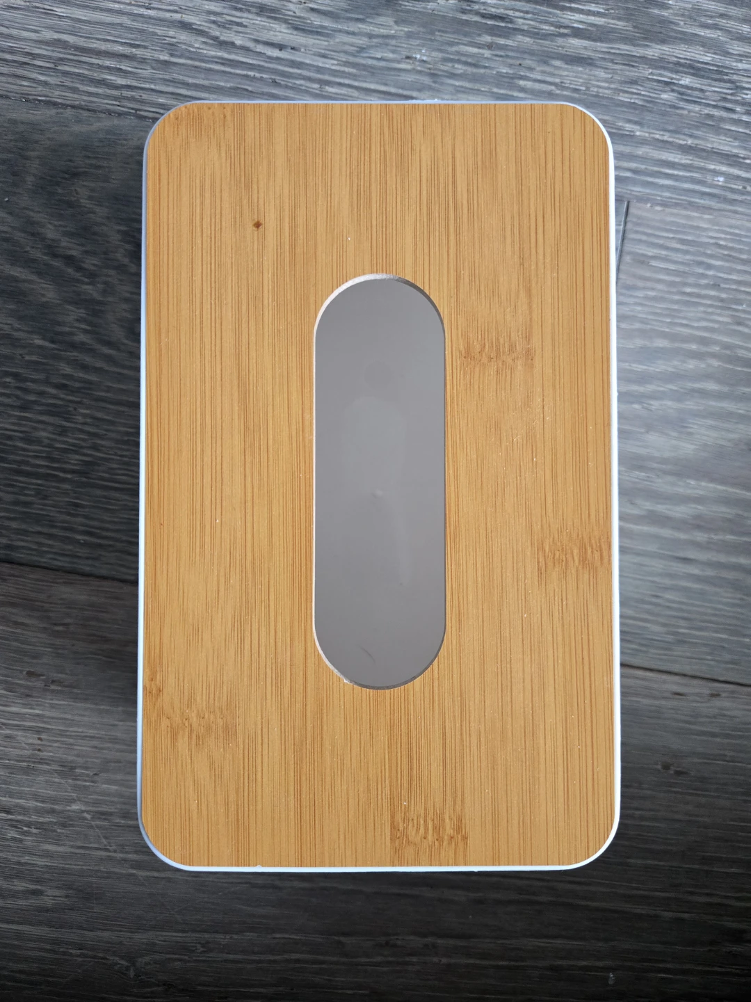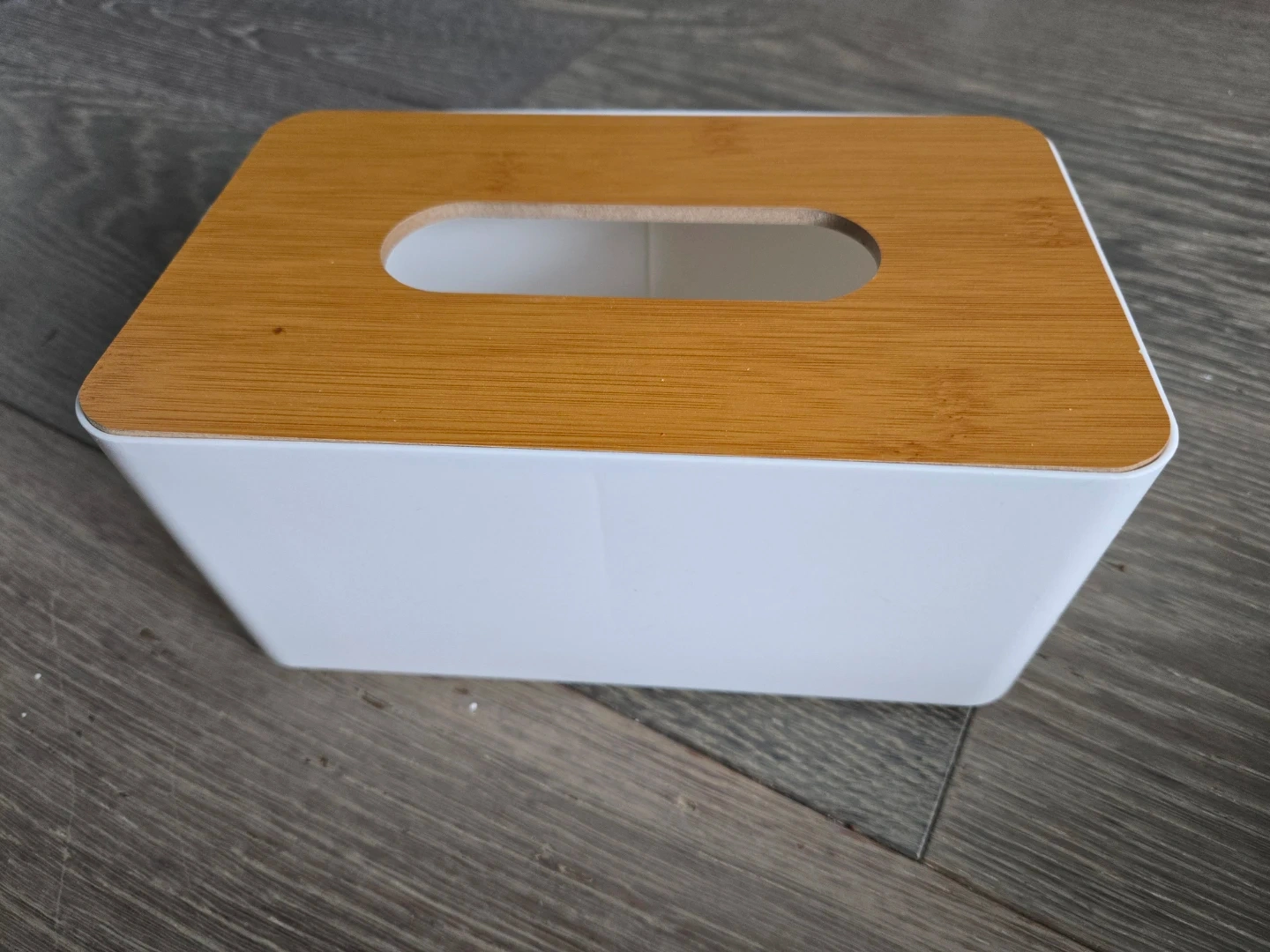 Here's a stylish tissue box cover to keep your tissues neat and organized! The top is a lovely bamboo color, and the rest of the box is white. It's in great condition and ready for a new home!